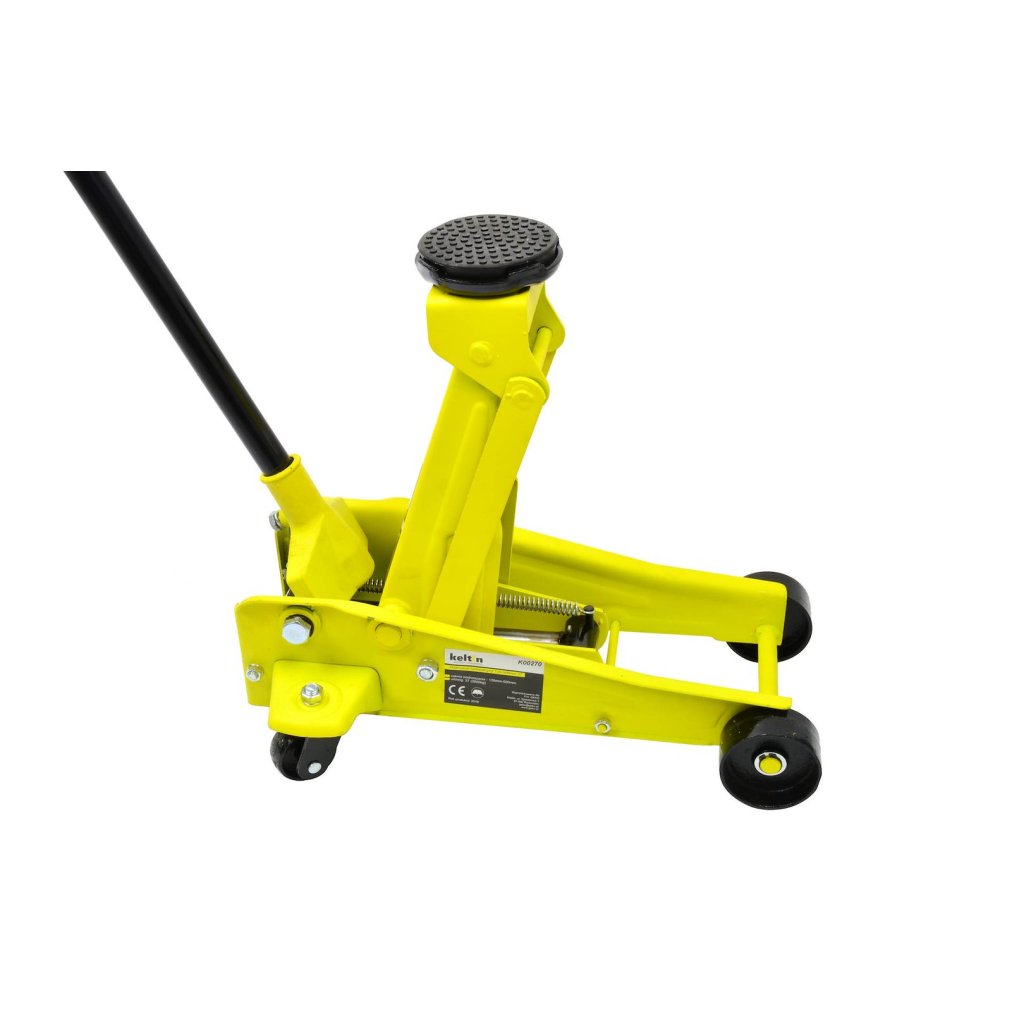 Hydraulický zvedák značky Keltin. Maximální nosnost až 3 tuny. Čtyři kola, z toho dvě otočná, zajišťují vysokou mobilitu zvedáku. Gumová podložka není součástí balení.