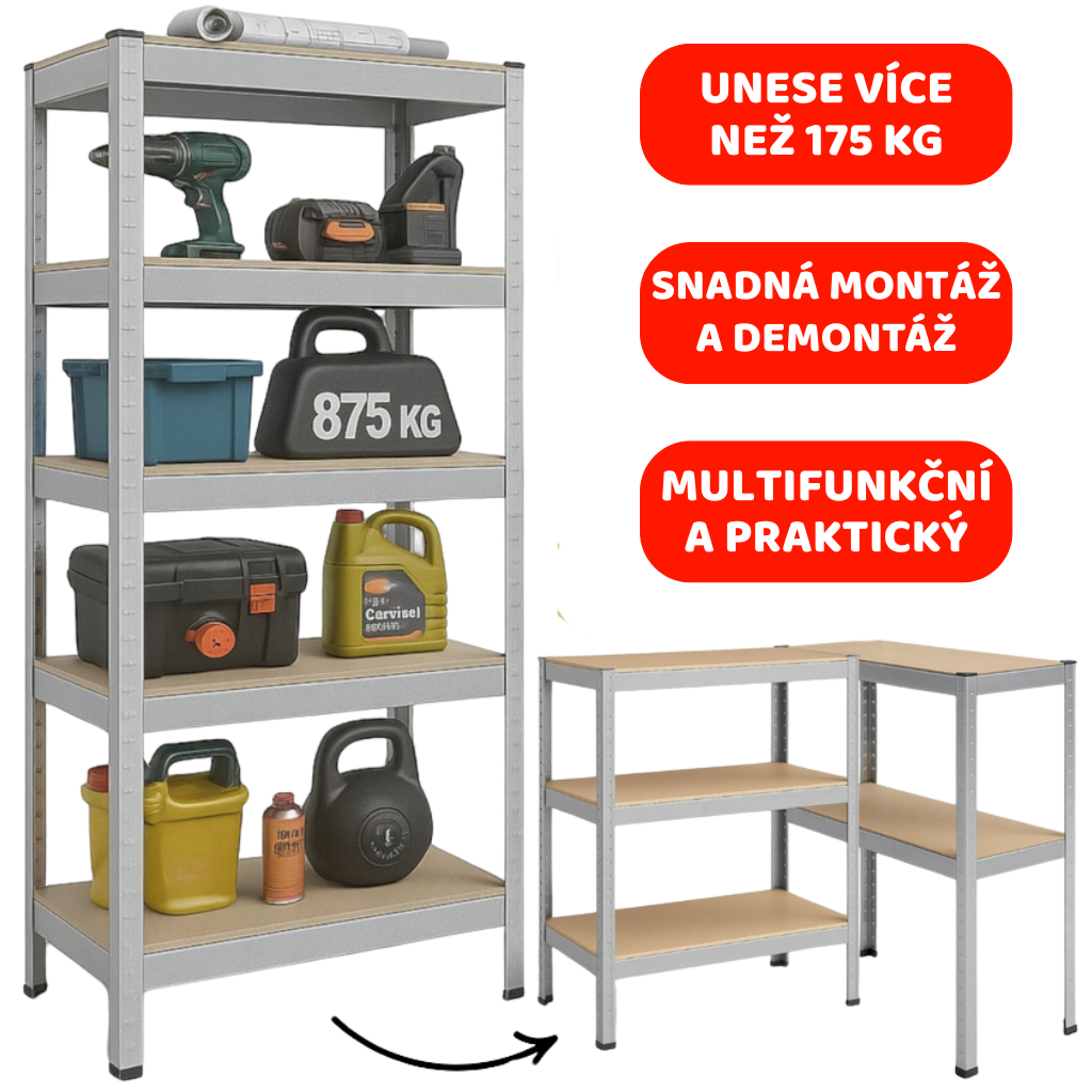 - Vybaven 5 policemi - každou je možné zatížit až 175 kg - Celková nosnost regálu je až 875 kg