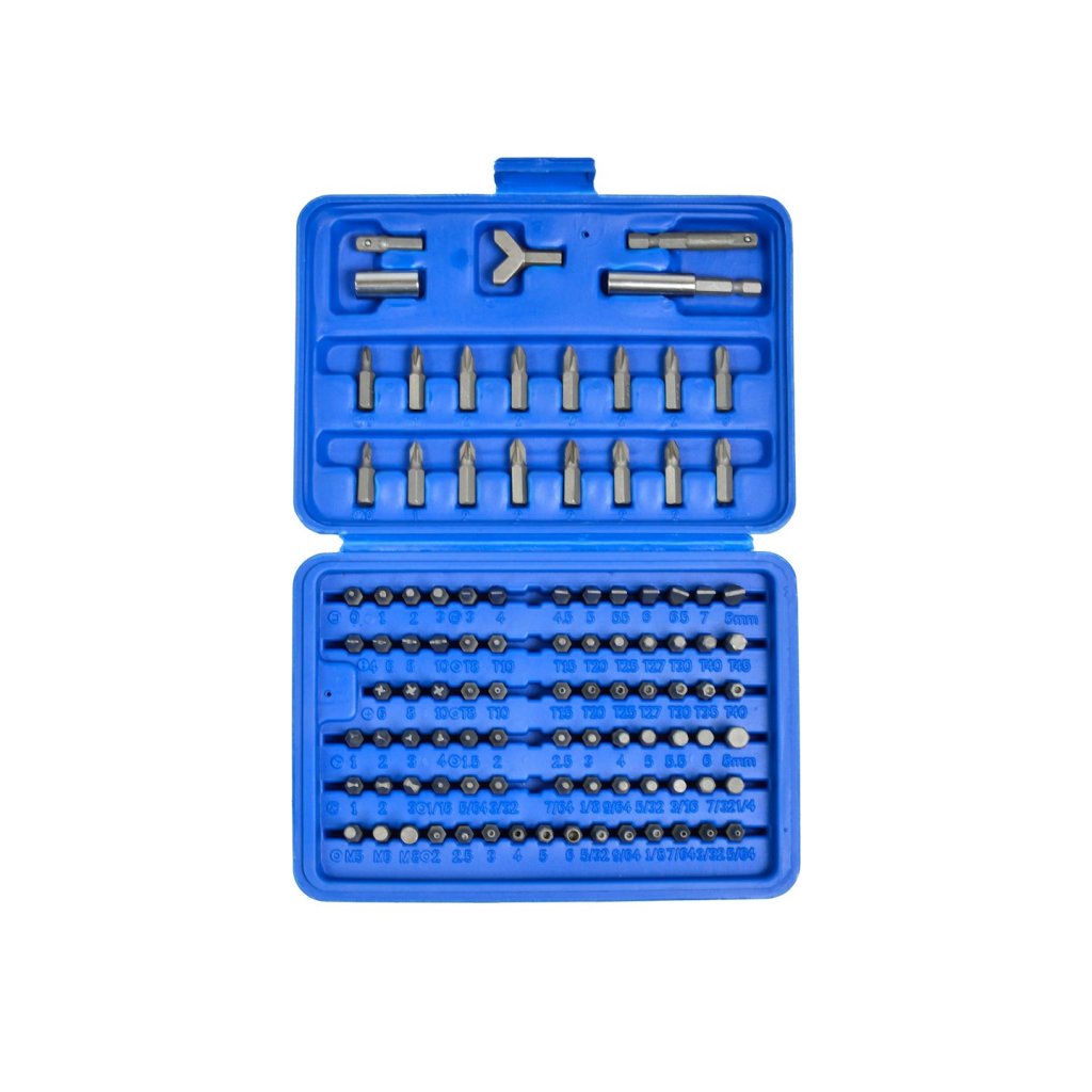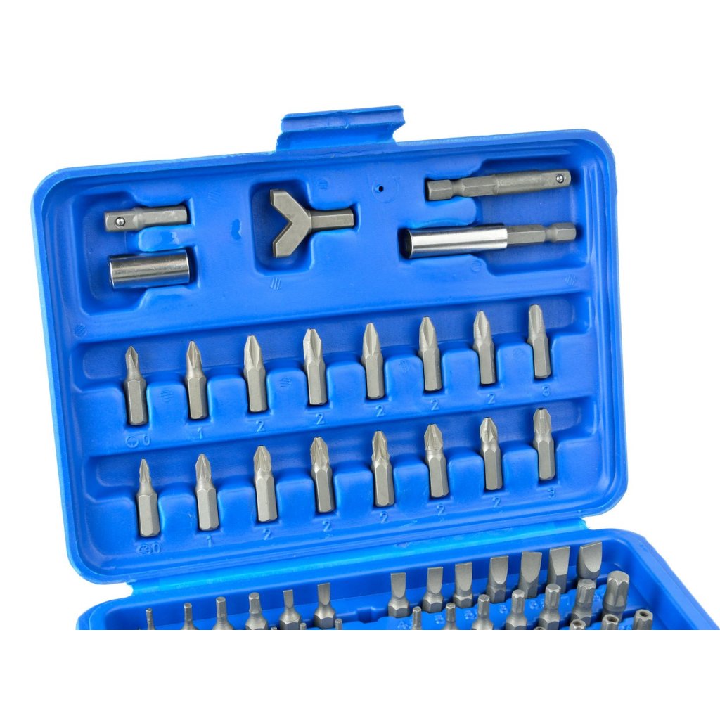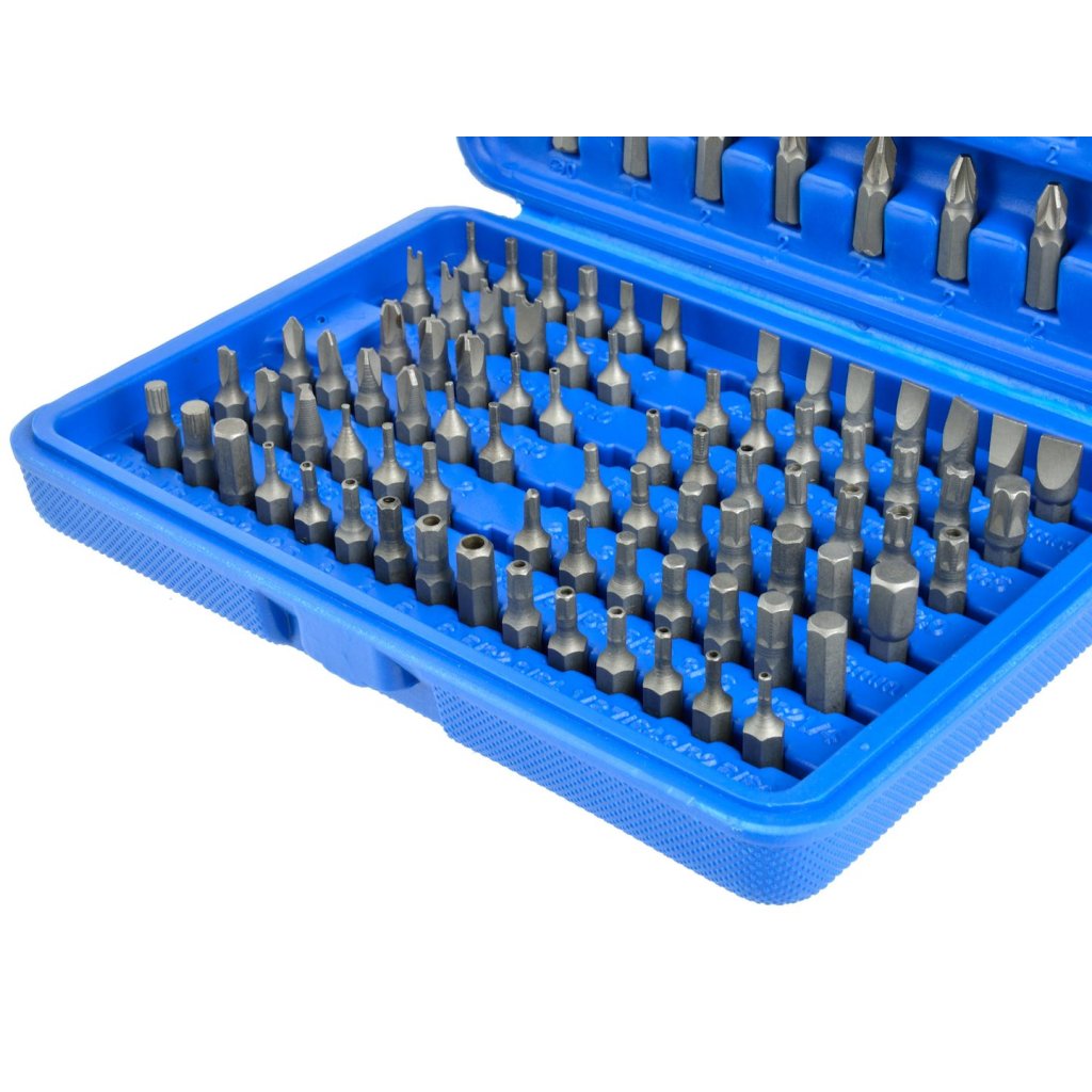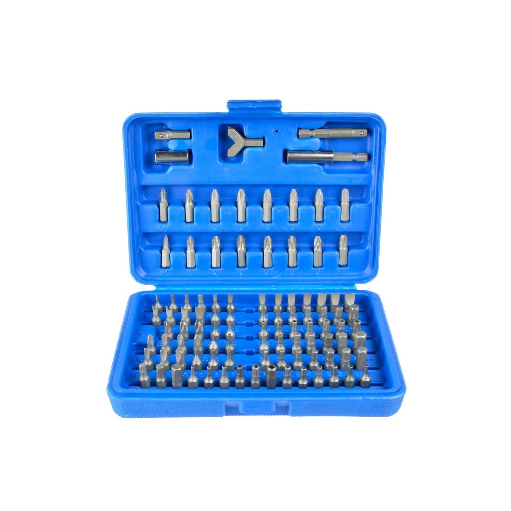 100dílná sada bitů z vyztužené uhlíkové oceli. Pro použití s elektrickým nářadím. Celek je zabalen v praktickém kufříku.