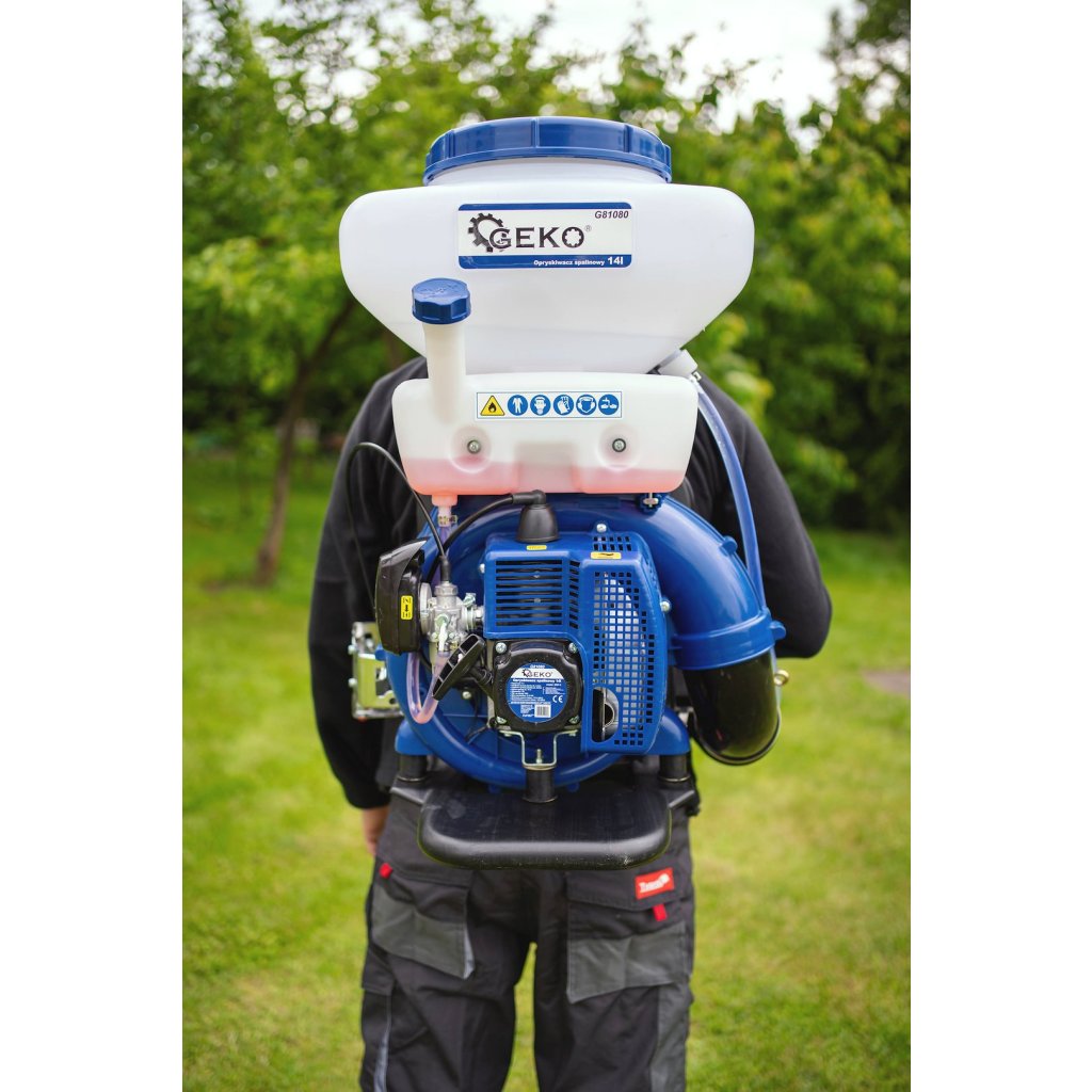 Zahradní postřikovač se spalovacím motorem 14 litrů. Batohový postřikovač se spalovacím motorem je přenosný, flexibilní a vysoce účinný nástroj pro ochranu rostlin. Může být použit k prevenci chorob rostlin a kontrole výskytu škůdců na velkých plantážích a polích s obilninami, v zahradách, na květinových záhonech, ovocných a čajových stromech atd. Nářadí je vhodné pro práci v horském, kopcovitém a jiném terénu.