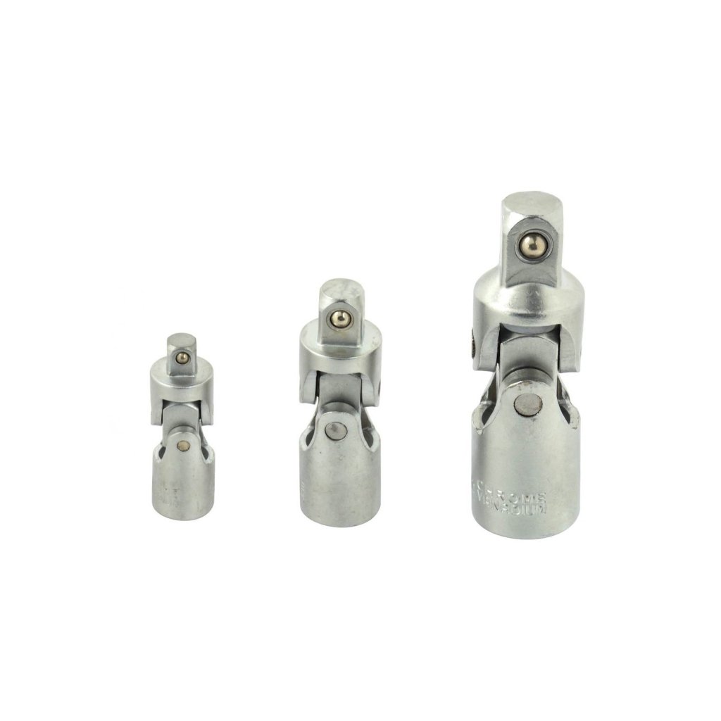 Sada univerzálních kloubů Cardana pro nástavce 1/4", 3/8" a 1/2". Klouby umožňují dosáhnout do těžko přístupných míst. Klouby jsou vyrobeny z odolné chrom-vanadové legované oceli.