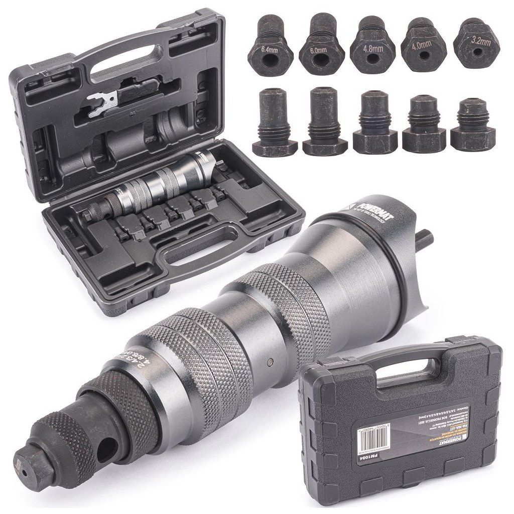 Přeměň svoji vrtačku nebo šroubovák na nitovačku. Adaptér POWERMAT PM-NIA-6ZT umožňuje rychlé, pevné a ergonomické provedení nitových spojů pomocí trhacích nýtů o průměru 3,2–6,4 mm. Je vyroben z oceli CrV-Mo s pevnou konstrukcí a je dodáván v praktickém kufru s příslušenstvím.