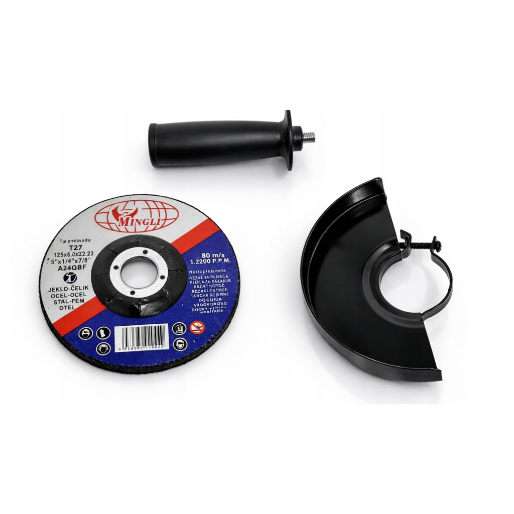 Úhlová bruska v sadě nabízí vysoký výkon a spolehlivost při broušení, řezání nebo odstraňování materiálu. Skvěle se hodí na kov, kámen, beton nebo dlažbu.