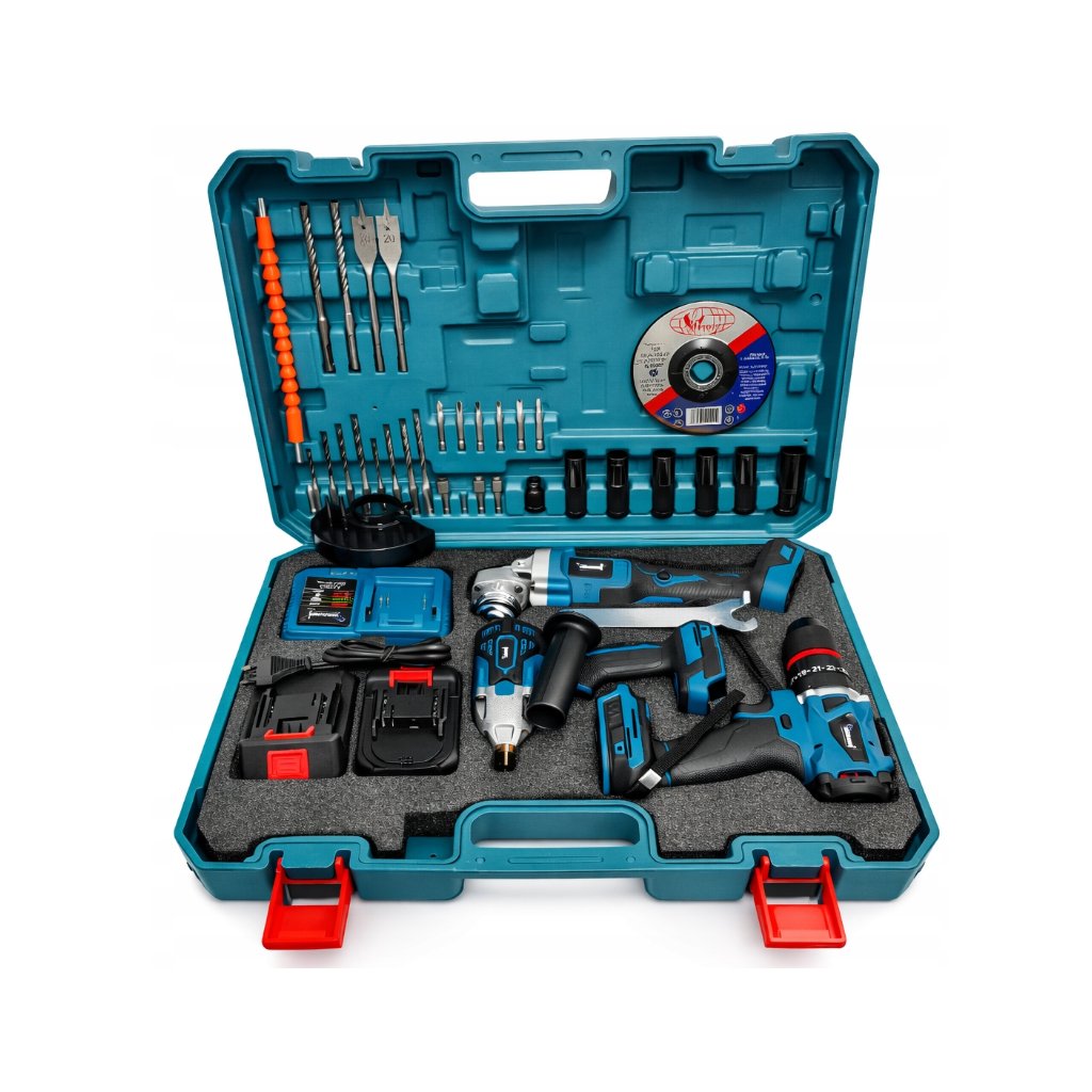 - ⚡ Výkonná aku sada 3 v 1 – vrtačka, úhlová bruska a rázový utahovák