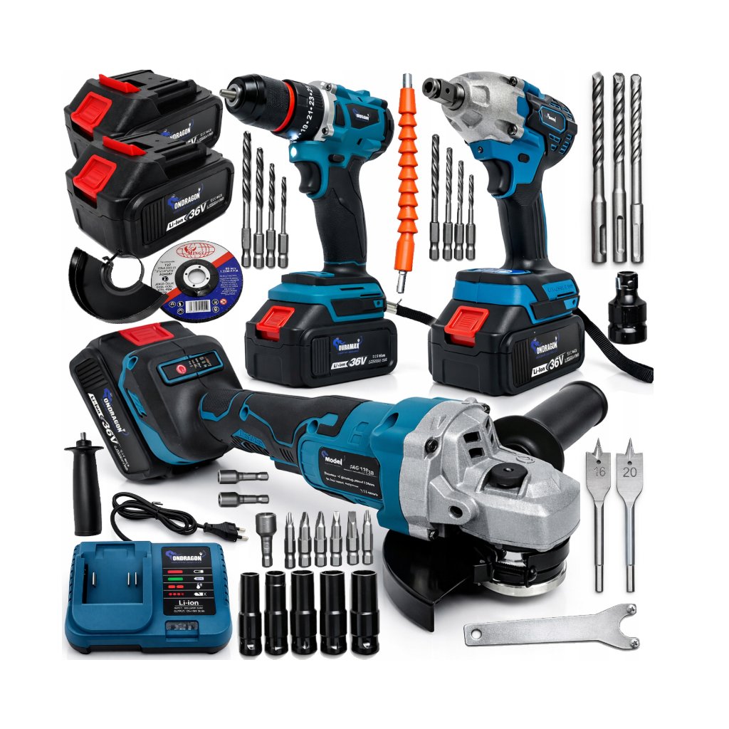 🛠️ Aku sada 3 v 1 36 V – vrtačka, úhlová bruska a rázový utahovák v jednom