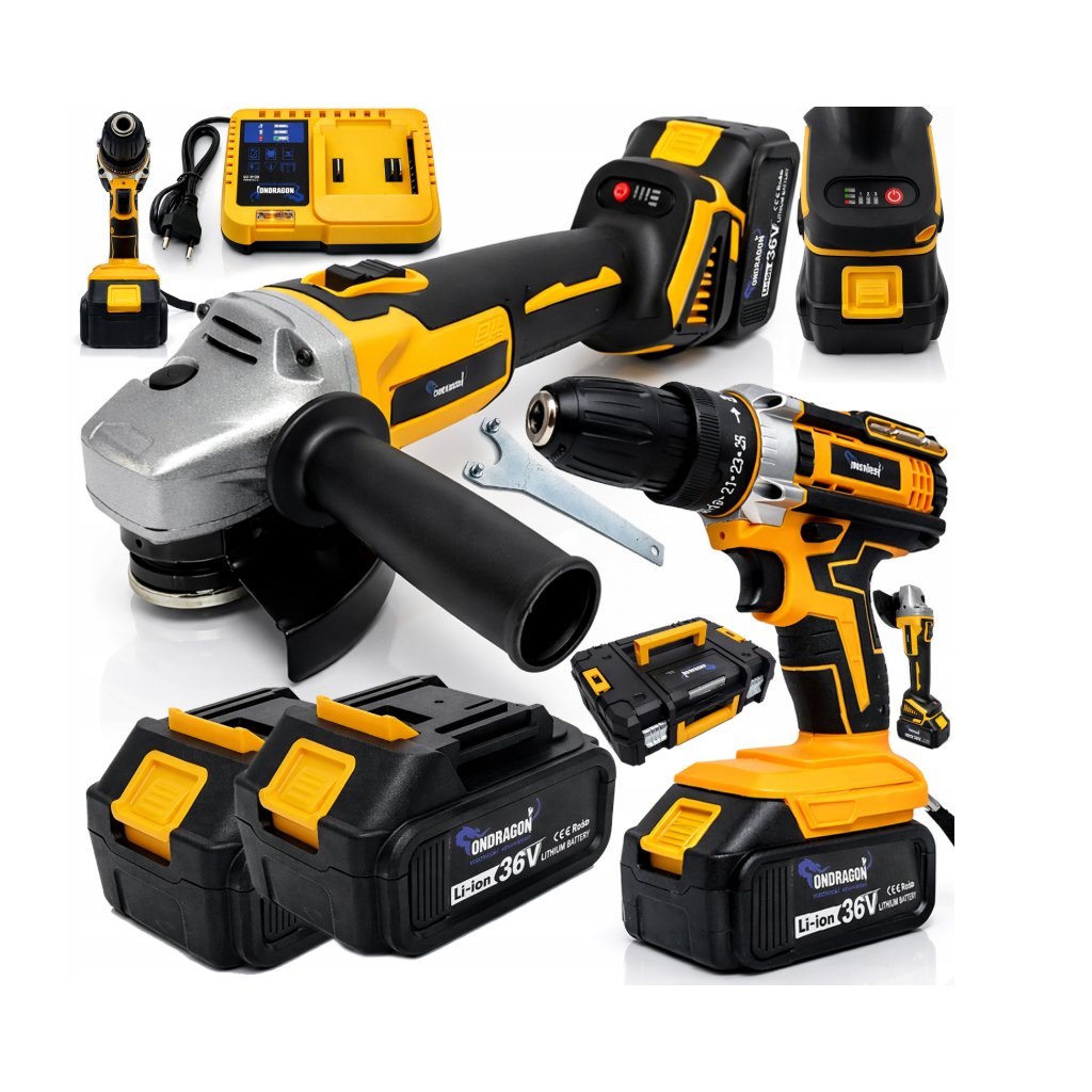 - ⚡ Výkonná sada 2×36 V – vrtačka + úhlová bruska