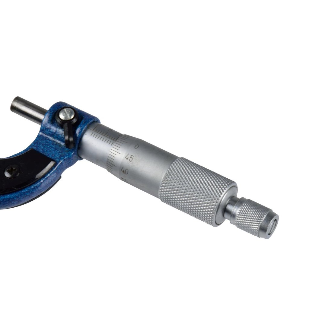 Přesný analogový mikrometr pro vnější měření s přesností 0,01 mm. Fungování přístroje je založeno na použití mikrometrického šroubu a noniusu. Přesný mikrometrický šroub se závitem 0,5 mm, spojený s bubnem mikrometru. Na jeho obvodu je vyryta stupnice (nonius). Spojka s západkou spojená s bubnem mikrometru zajišťuje správný a stálý tlak čelistí.