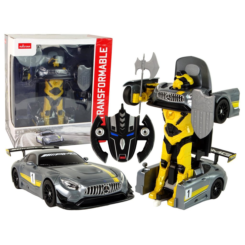 Auto R/C Mercedes Rastar Robot Sterowany Transformers 1:14 Tento model R/C auta je autentickou replikou Mercedes-AMG GT3 Jeho stříbrná barva se žlutými doplňky mu dodává dynamický a jedinečný vzhled