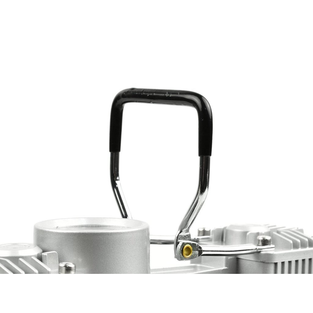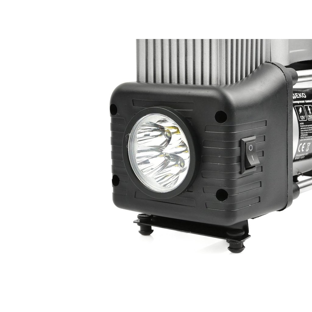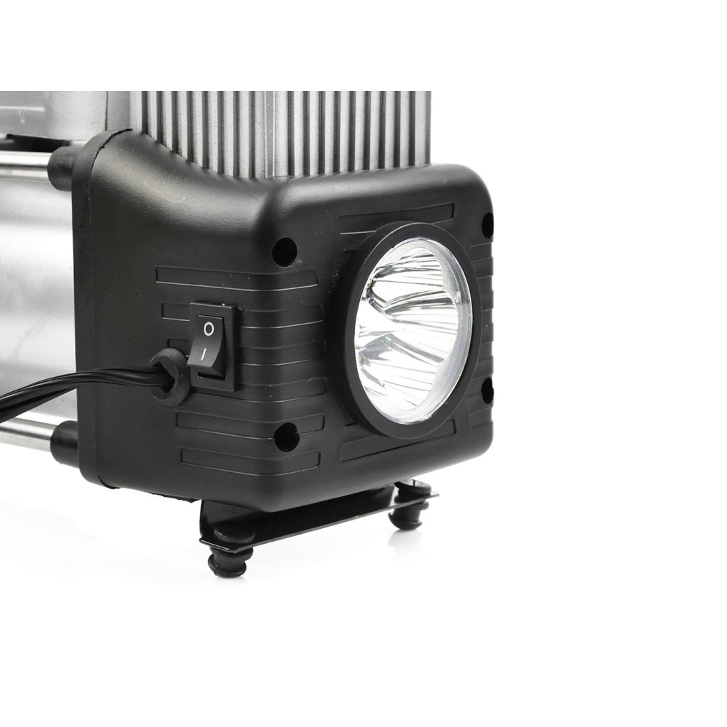 Kompresor do automobilu 250 W napájený napětím 12–13,5 V ze zásuvky zapalovače nebo přímo z akumulátoru. Vybavený čitelným manometrem se stupnicí ve 3 jednotkách: Bar, PSI a kg/cm2. Má našroubovatelnou koncovku přizpůsobenou pro automobilové ventily, které se používají také u motocyklů a jízdních kol. Vestavěná svítilna umožňuje pohodlné používání kompresoru v noci, aniž byste potřebovali další zdroj světla. Součástí sady je navíc spirálová pneumatická hadice a sada 3 koncovek pro nafukování míčů, matrací atd.