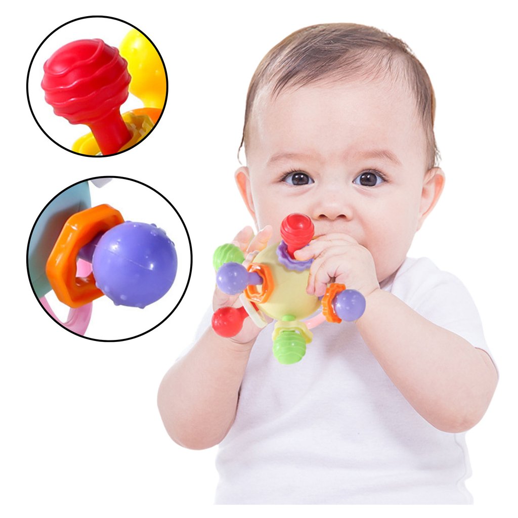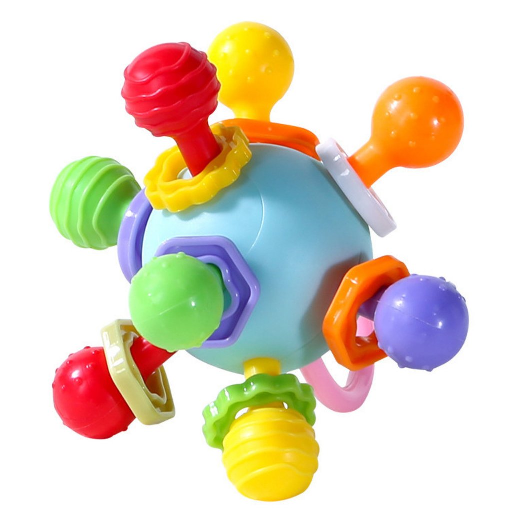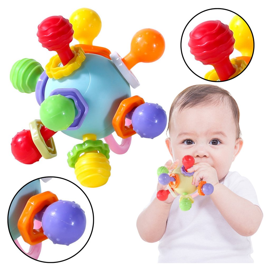 Barevná Senzorická Hračka s Chrastítkem pro Kojence je multifunkční hračka, která podporuje vývoj kojence v nejintenzivnějším období – fázi prořezávání zoubků a ústního zkoumání okolí.