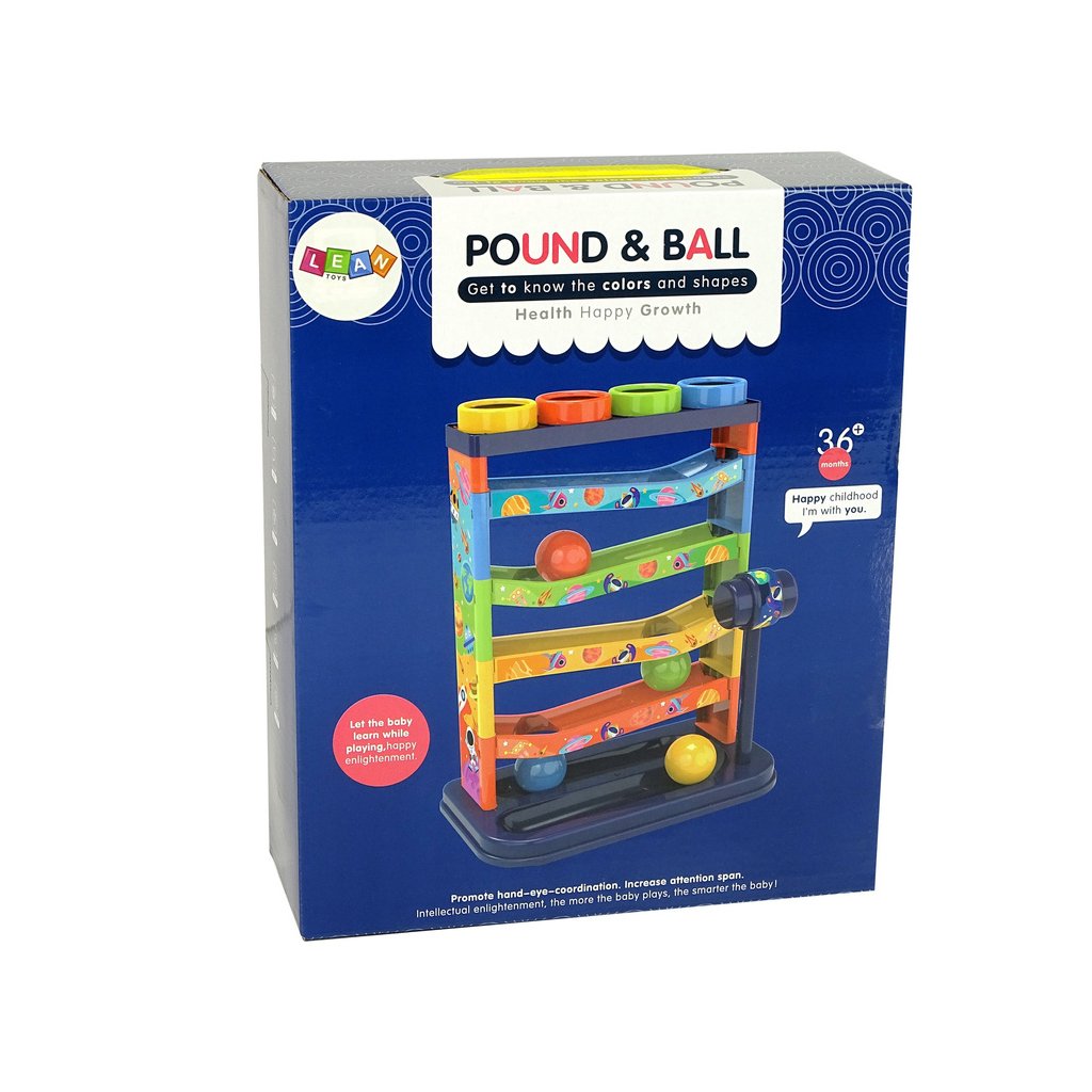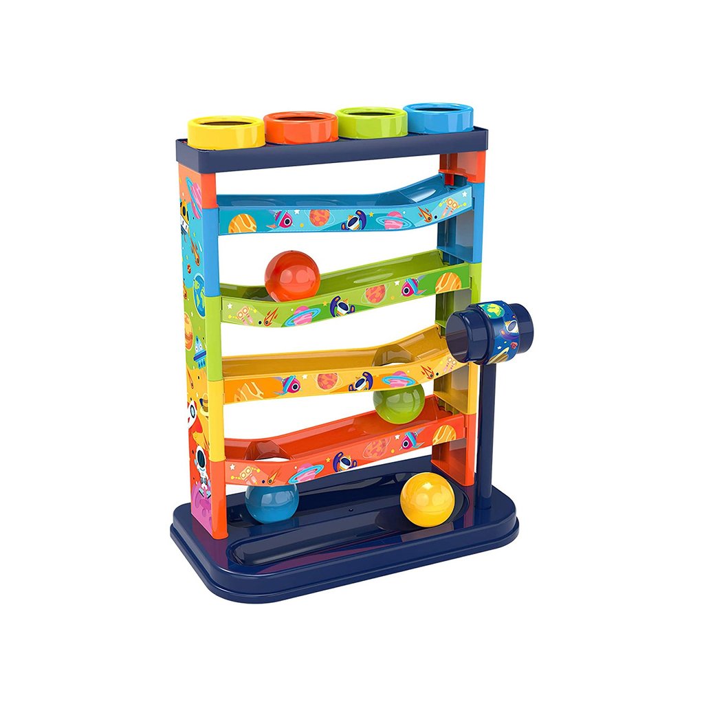 Vložte míčky do otvoru v první plošině a nechte je volně padat po schodech dolů. Aby míček spadl dovnitř, je třeba použít kladívko, čímž se procvičuje odhad vzdálenosti, přesnost a koordinace očí a rukou. Každý otvor má jinou barvu, stejně jako kuličky, můžete zkusit přiřadit správné barvy, což procvičí u malého dítěte jeho vnímavost a zrakové funkce. Kuličky při pohybu vydávají zvuky jako chrastítka, což upoutá pozornost malého dítěte.
