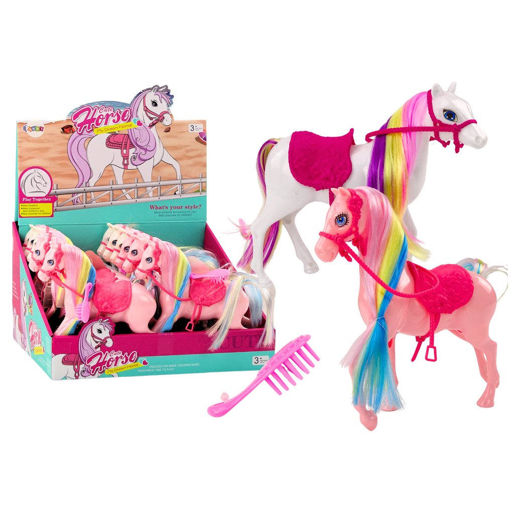Představujeme okouzlující set: Barevný kůň s růžovým sedlem a kartáčem ve dvou nádherných barvách: bílý a růžový. Tento krásný kůň s barevnou hřívou a ocasem se stane oblíbeným společníkem vašeho dítěte při hraní! Díky jeho modrým očím vypadá naprosto rozkošně, a růžové sedlo dokonale dotváří jeho magický vzhled. V balení také najdete růžový kartáč, ideální pro úpravu hřívy a ocasu vašeho oblíbence, což umožňuje dítěti starat se o svého koníka kdykoli.