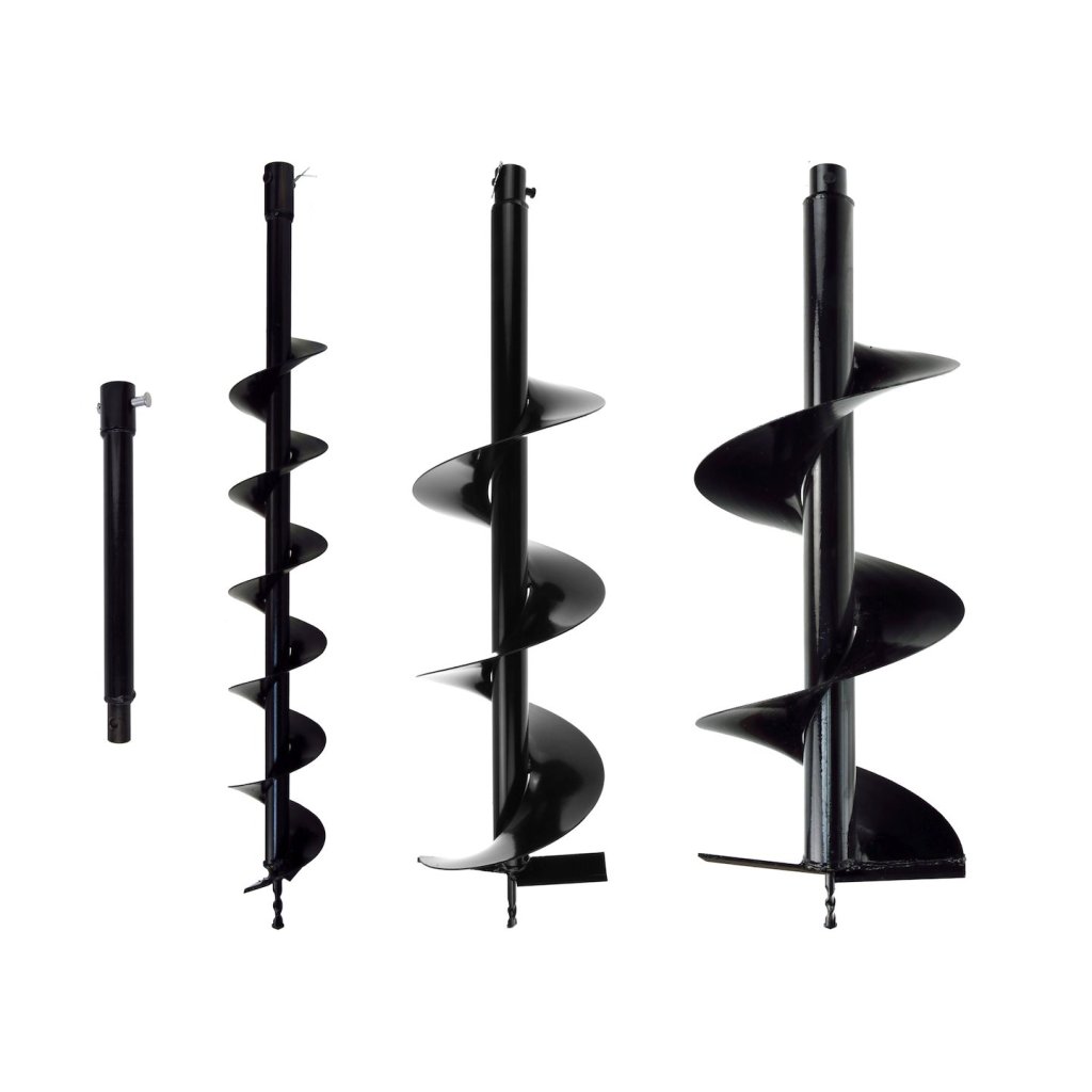 Benzinový vrták do půdy s nominálním výkonem 1,4 kW. Vrták v sadě s vrtáky o průměru 10, 20, 30 cm a s prodloužením 50 cm.