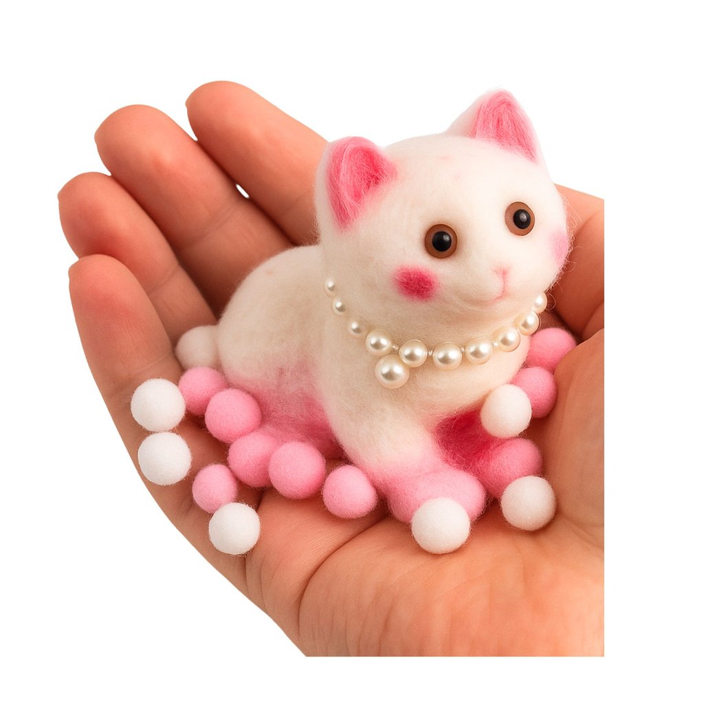 Každý detail tohoto kotka je vytvořen s precizností. Povrch pokrytý imitací jemného futra dodává kotkovi realistický vzhled, zatímco bílo-růžové pomponky přidávají na jeho jedinečném kouzlu. Perlový náhrdelník pak kotka korunuje jako elegantního společníka pro váš stůl nebo poličku.