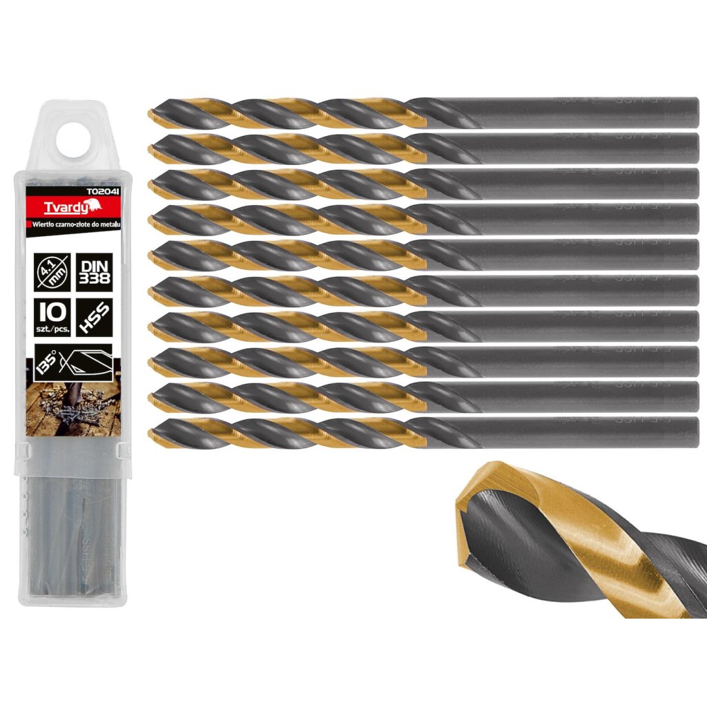 Zlaté a černé vrtáky do kovu vyrobené z rychlořezné oceli 4341 HSS, pokryté vrstvou TiN (nitrid titanu). Vrtáky jsou v souladu s normou DIN 338. Válcové držadlo.