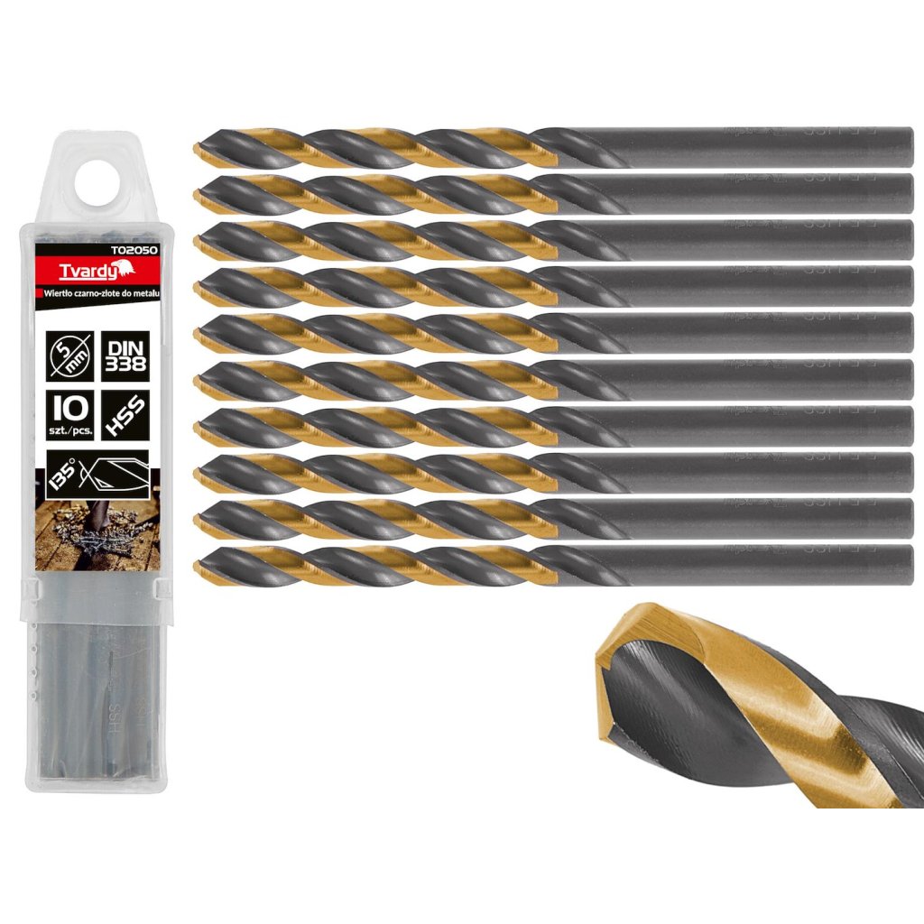 Zlaté a černé vrtáky do kovu vyrobené z rychlořezné oceli 4341 HSS, pokryté vrstvou TiN (nitrid titanu). Vrtáky jsou v souladu s normou DIN 338. Válcové držadlo.