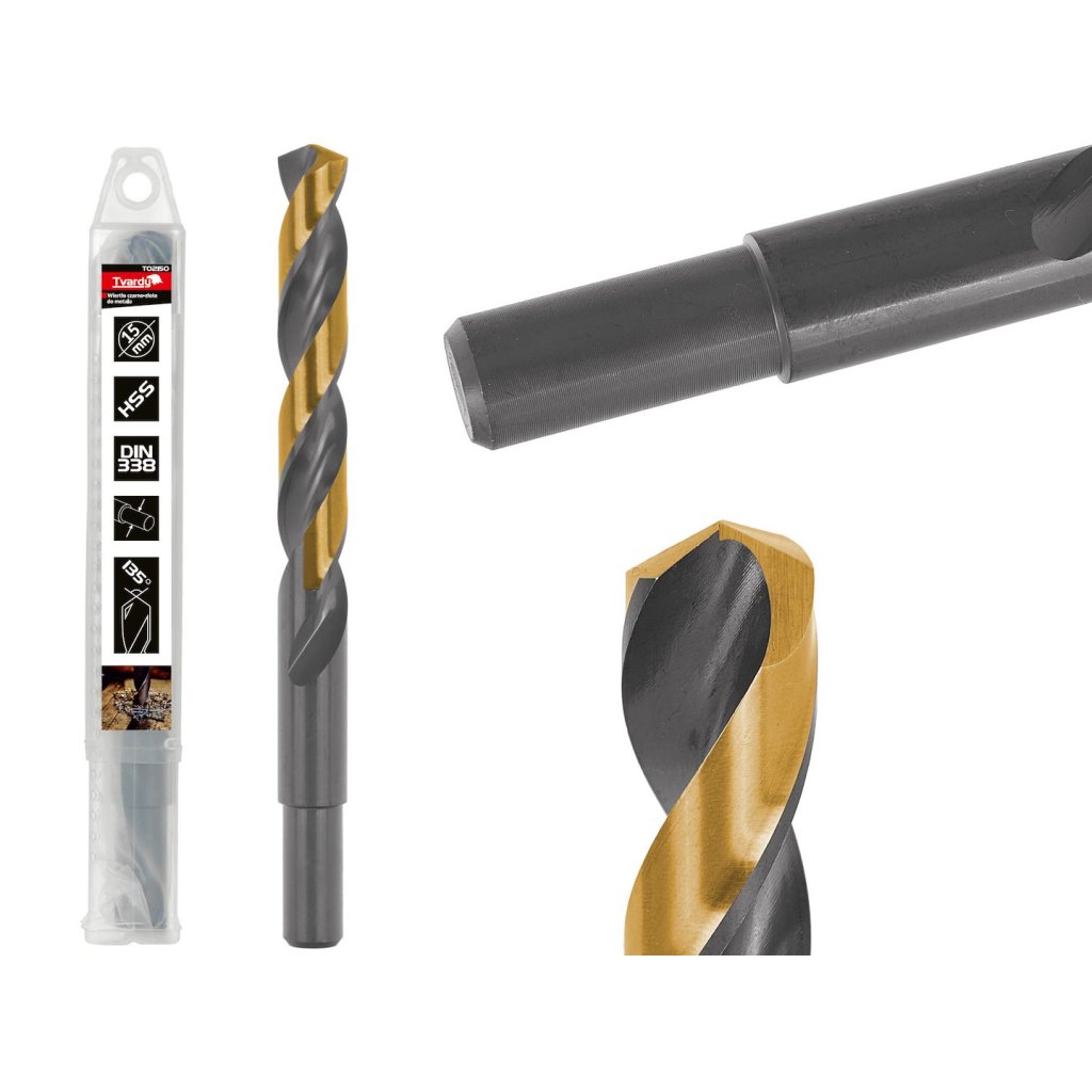 Zlaté a černé vrtáky do kovu vyrobené z rychlořezné oceli 4341 HSS, potažené vrstvou TiN (nitrid titanu). Vrtáky jsou v souladu s normou DIN 338. Válcové, podříznuté držení, které umožňuje použití vrtáků o větším průměru, než je rozsah vrtacího držáku.