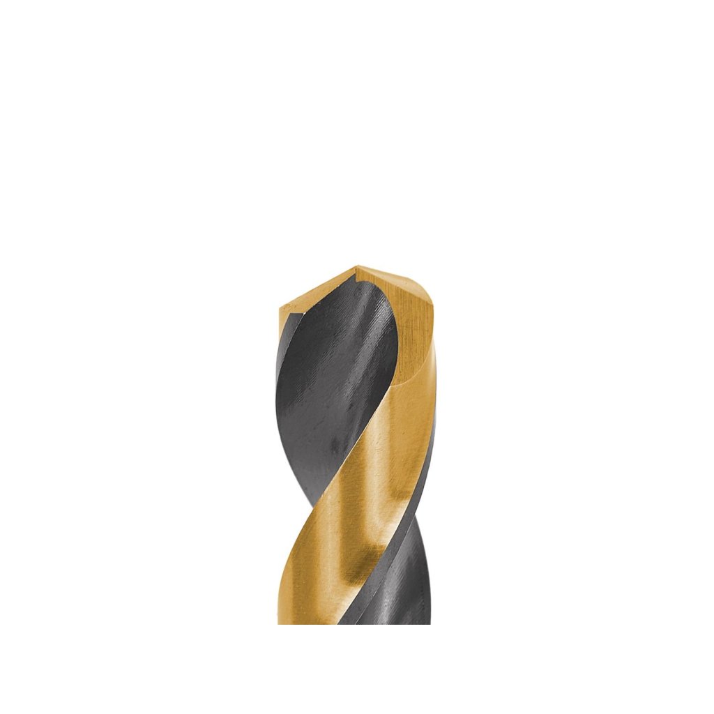 Zlaté a černé vrtáky do kovu vyrobené z rychlořezné oceli 4341 HSS, potažené vrstvou TiN (nitrid titanu). Vrtáky jsou v souladu s normou DIN 338. Válcové, podříznuté držení, které umožňuje použití vrtáků o větším průměru, než je rozsah vrtacího držáku.