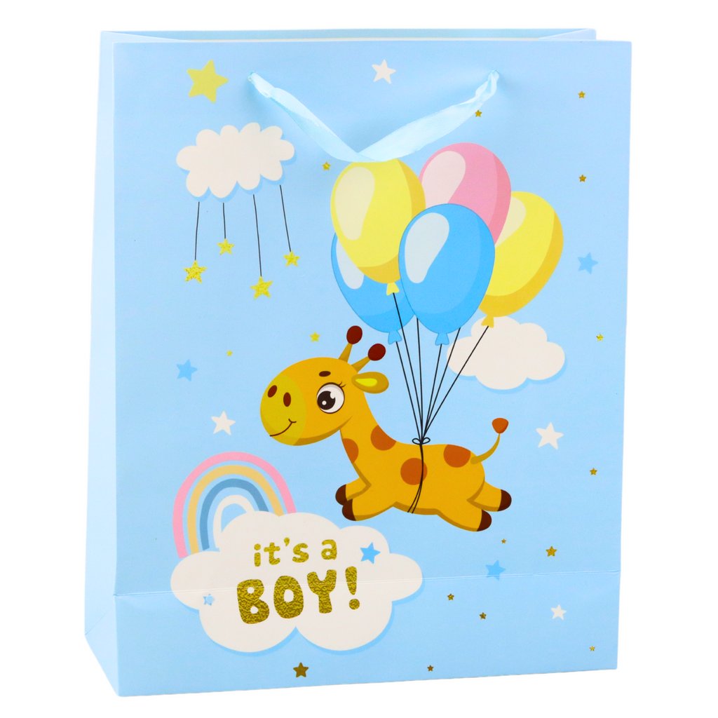 - V nádherné bledě modré barvě s lesklým nápisem a motivem veselé žirafy, která vznáší se na balónech, tato taška dodá každému dárku dotek radosti a magie
