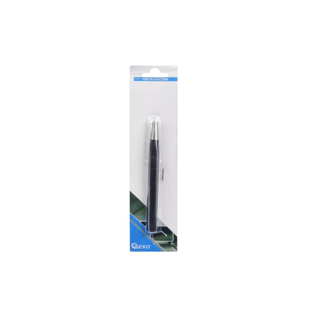 Děrovač 6x10x120mm vyrobený z nástrojové oceli, určený k vyražení malých prohlubní do kovu, které výrazně usnadňují např. přesné vrtání.