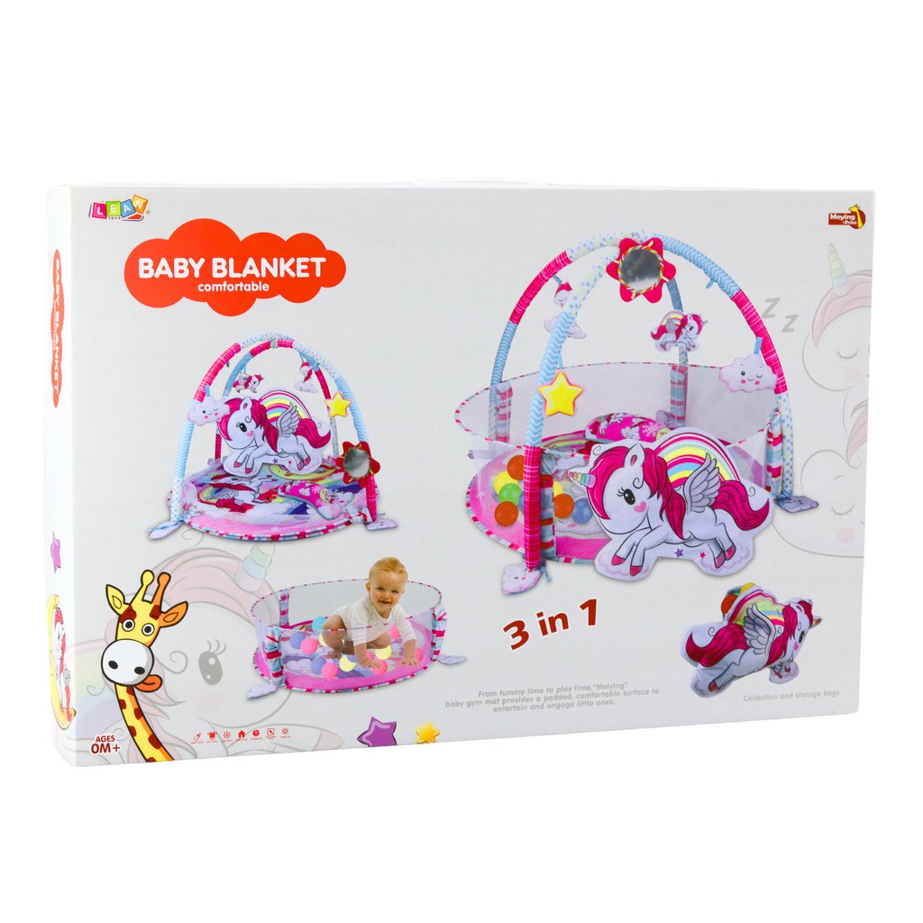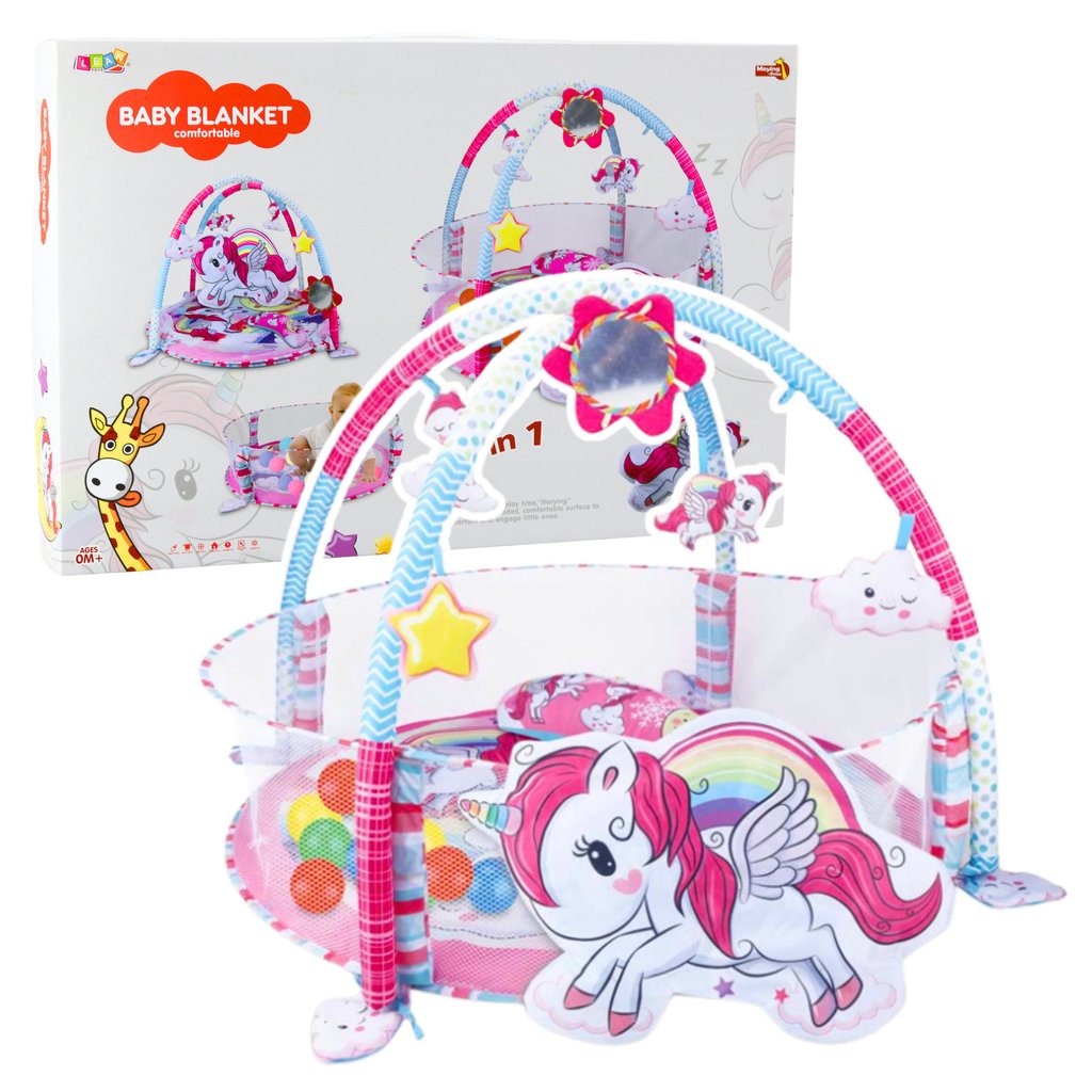 Dětská edukační hrací podložka s míčky 3v1 Jednorožec Růžová