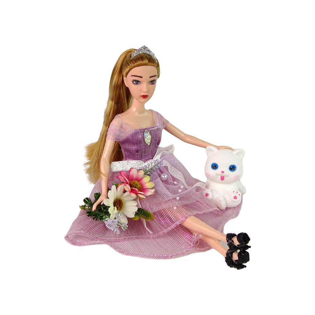 Panenka pro děti Emily s dlouhými vlasy a bílým koťátkem Představujeme vám roztomilou panenku Emily s dlouhými blond vlasy Tato krásná panenka je oblečena do dlouhých šatů, které okouzlují třpytivými růžovými detaily, ozdobnými perličkami a mašlemi