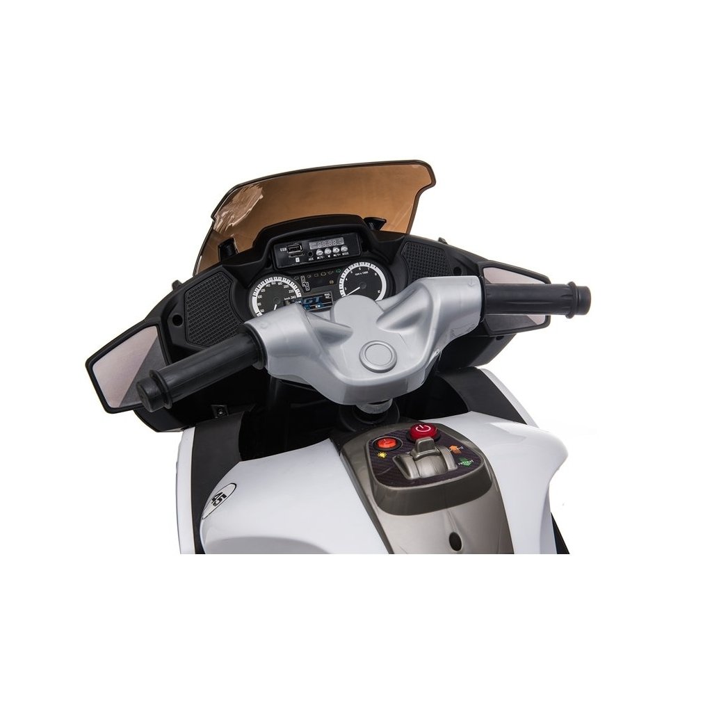 Bílá dětská akumulátorová motorka model XMX609 , jistě vykouzlí úsměv na tváři každého maléhodítěte a zpestří procházky a čas strávený na čerstvém vzduchu Jeho konstrukce je přizpůsobena výšce několik let starých dětí, díky čemuž je skvělým nápadem na první akumulátorové vozidlo pro dítě