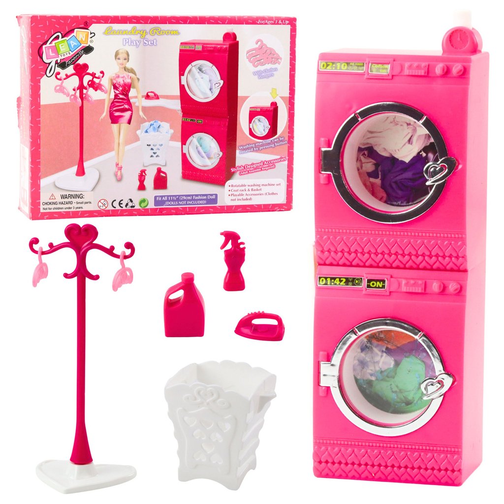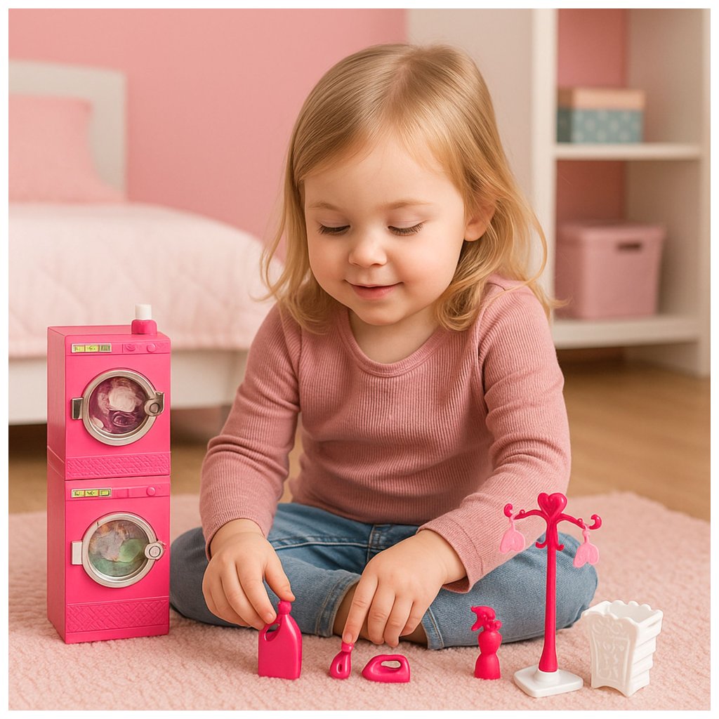 Všechny detaily jsou pečlivě navrženy tak, aby co nejvěrněji připomínaly skutečnou prádelnu, což dětem umožňuje rozvíjet fantasii, koordinaci rukou a dovednosti v roli. Náš set také obsahuje imitace detergentů a sadu věšáků, které pomáhají udržet pořádek v šatně panenek.