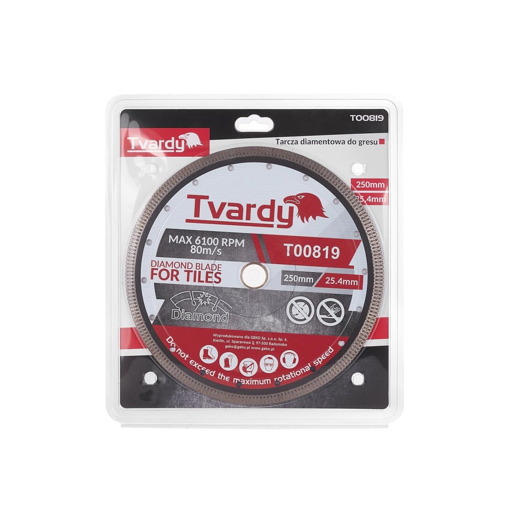 Profesionální diamantový kotouč na dlaždice značky Tvardy. Kotouč má rýhovaný okraj s uzavřeným profilem a je určený k řezání tvrdých materiálů, jako jsou porcelánové dlaždice, mramor, střešní tašky, žula, pískovec a křemen. Diamantový kotouč o průměru 250 mm a tloušťce 1,6 mm. Má diamantový nános o výšce10 mm a tloušťce 2,0 mm.