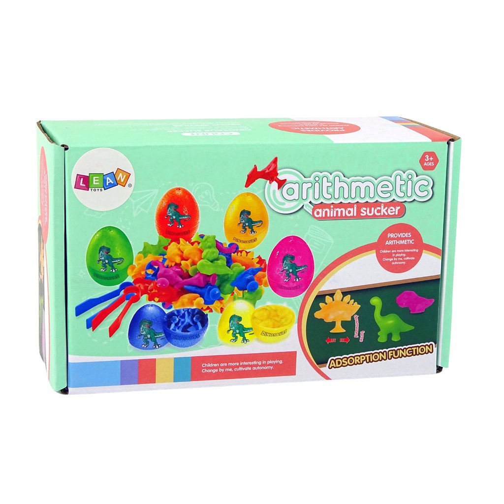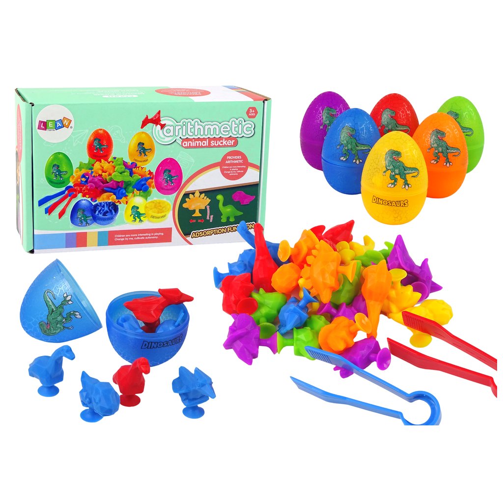 Sada obsahuje šest barevných vajec, v každém z nich jsou schované malé figurky dinosaurů s přísavkami Otevřete barevná vejce, vyjměte malé dinosaury z vajíček a seřaďte je podle barev!