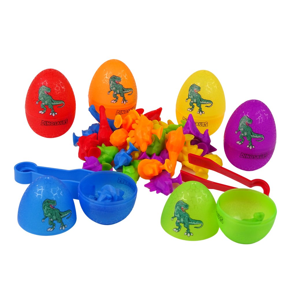 - Otevřete barevná vejce, vyjměte malé dinosaury z vajíček a seřaďte je podle barev!