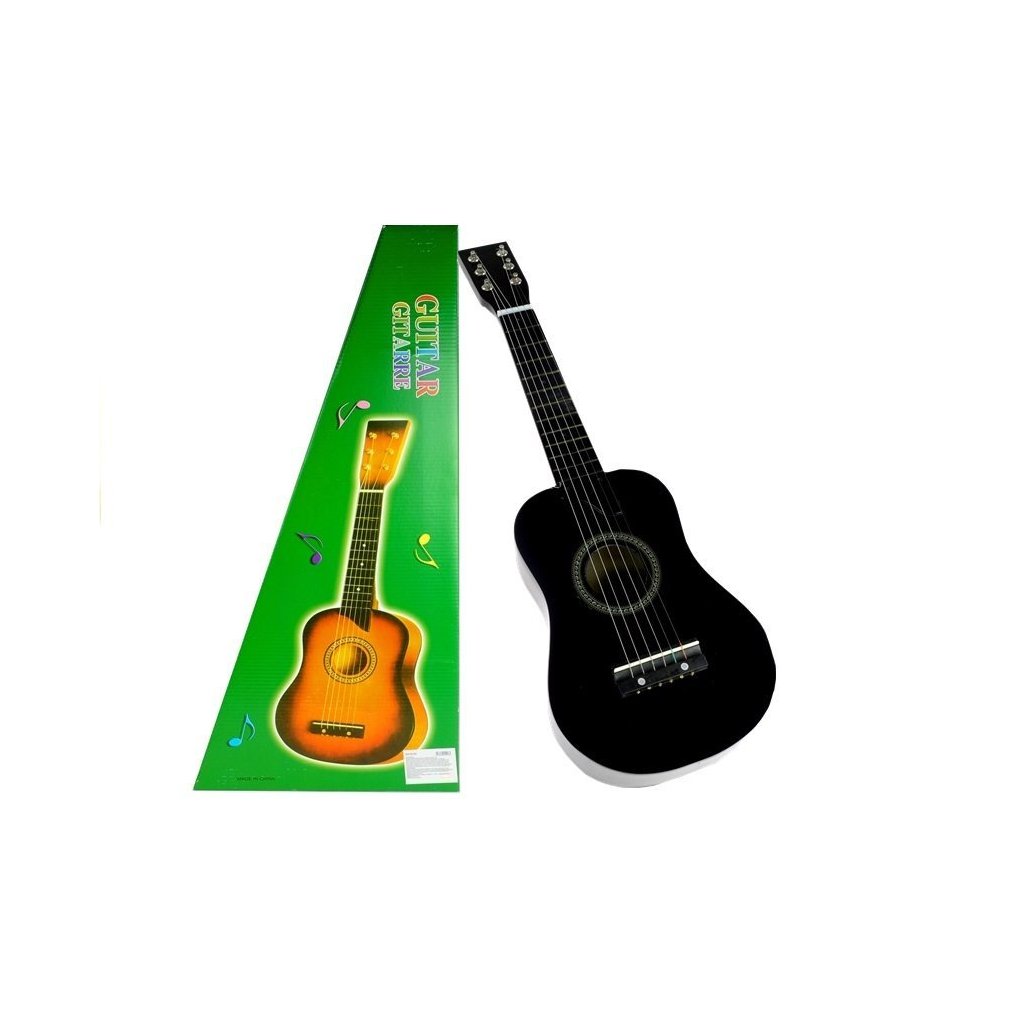 Dřevěná kytara 60 cm v černé barvě. Tato úžasná kytara je skutečným hudebním nástrojem pro vaše dítě. Od skutečné kytary se liší velikostí, která je zde přizpůsobena potřebám malého dítěte. Pečlivé zpracování z lakovaného dřeva a možnost ladění šestistrunné kytary pomocí speciálních strun umožňuje vydávat reálné zvuky a vytvářet krásnou hudbu. Váš mladý muzikant bude touto kytarou nadšený.