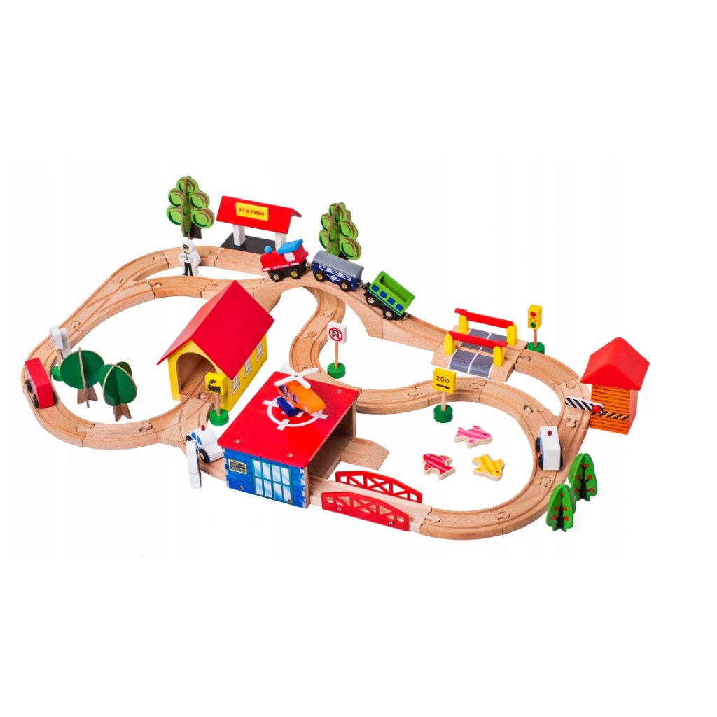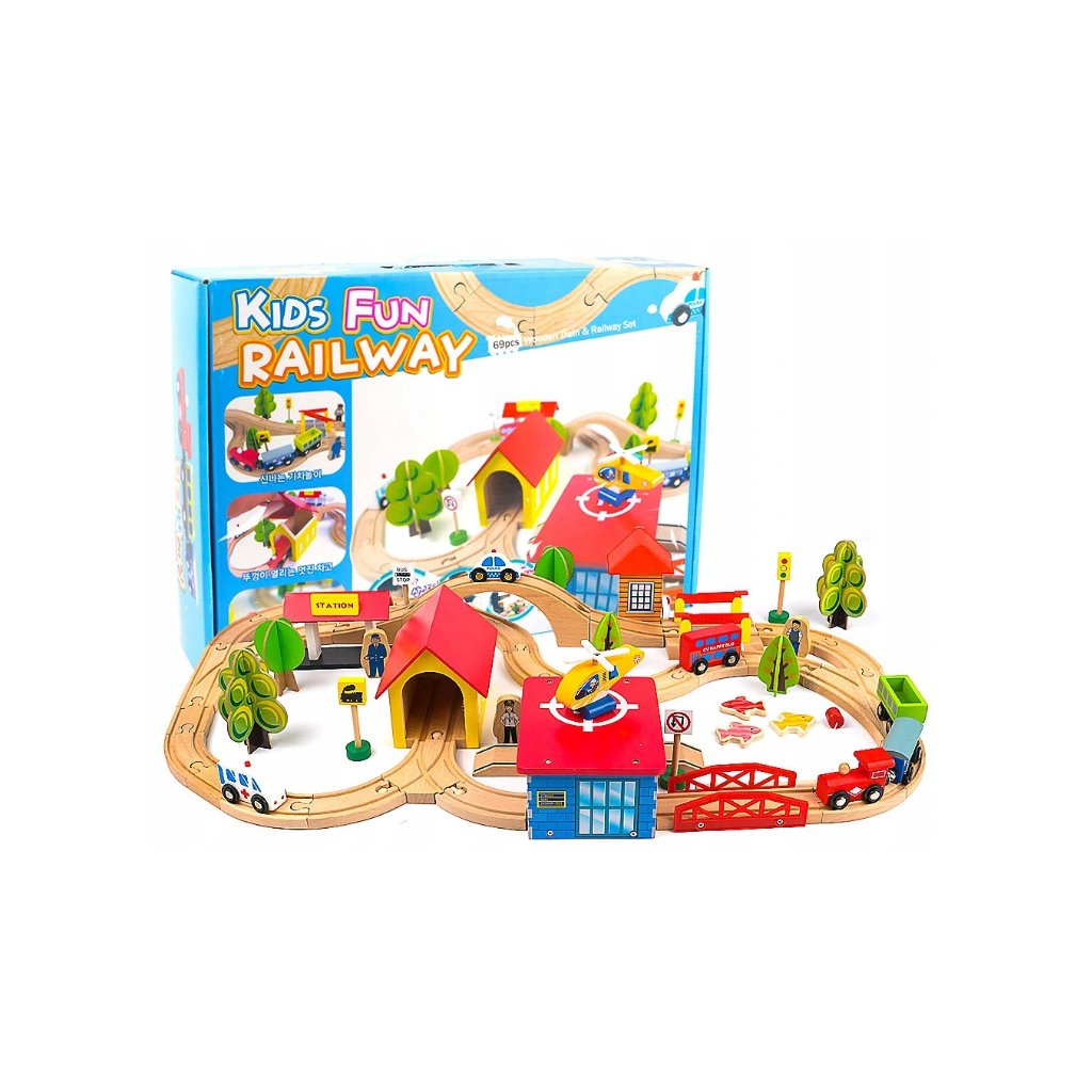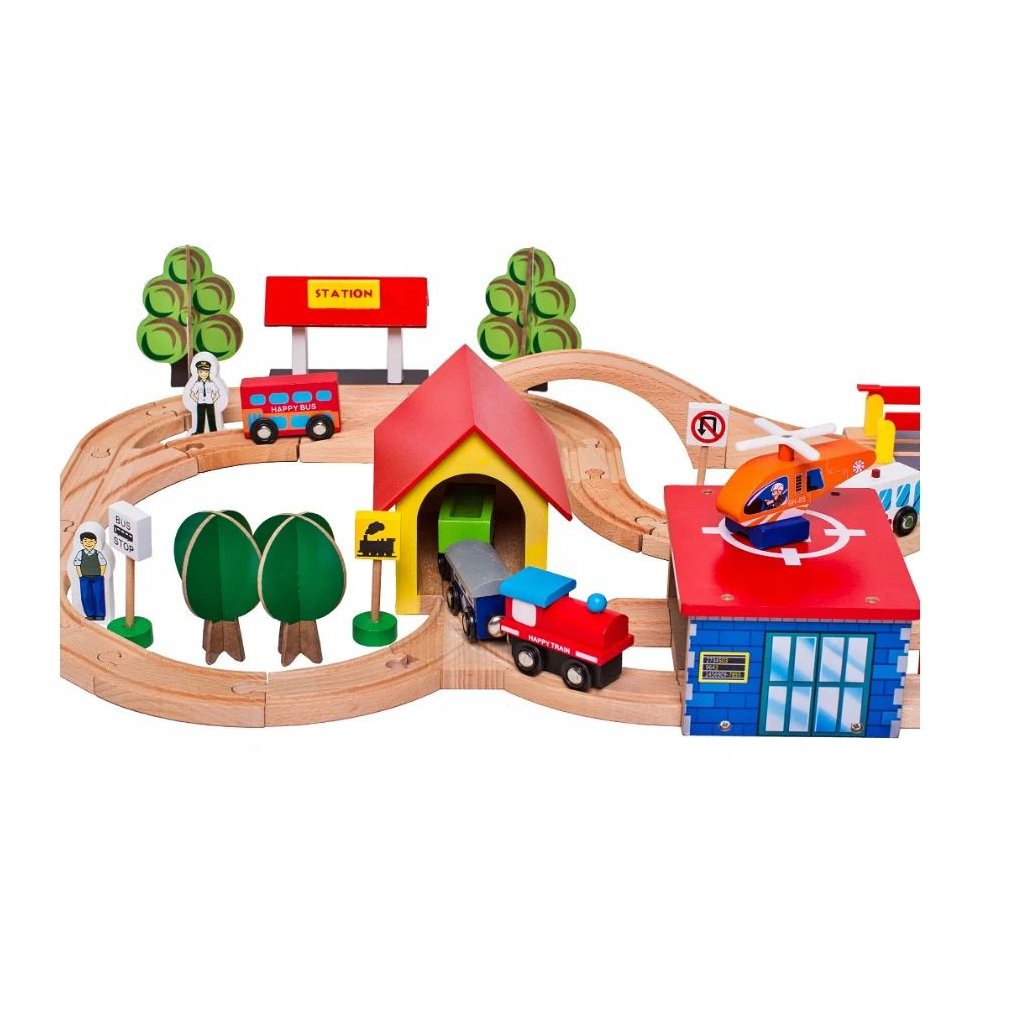 Dřevěná Kolejová Sada Autíčka Stromy Budovy Helikoptéra