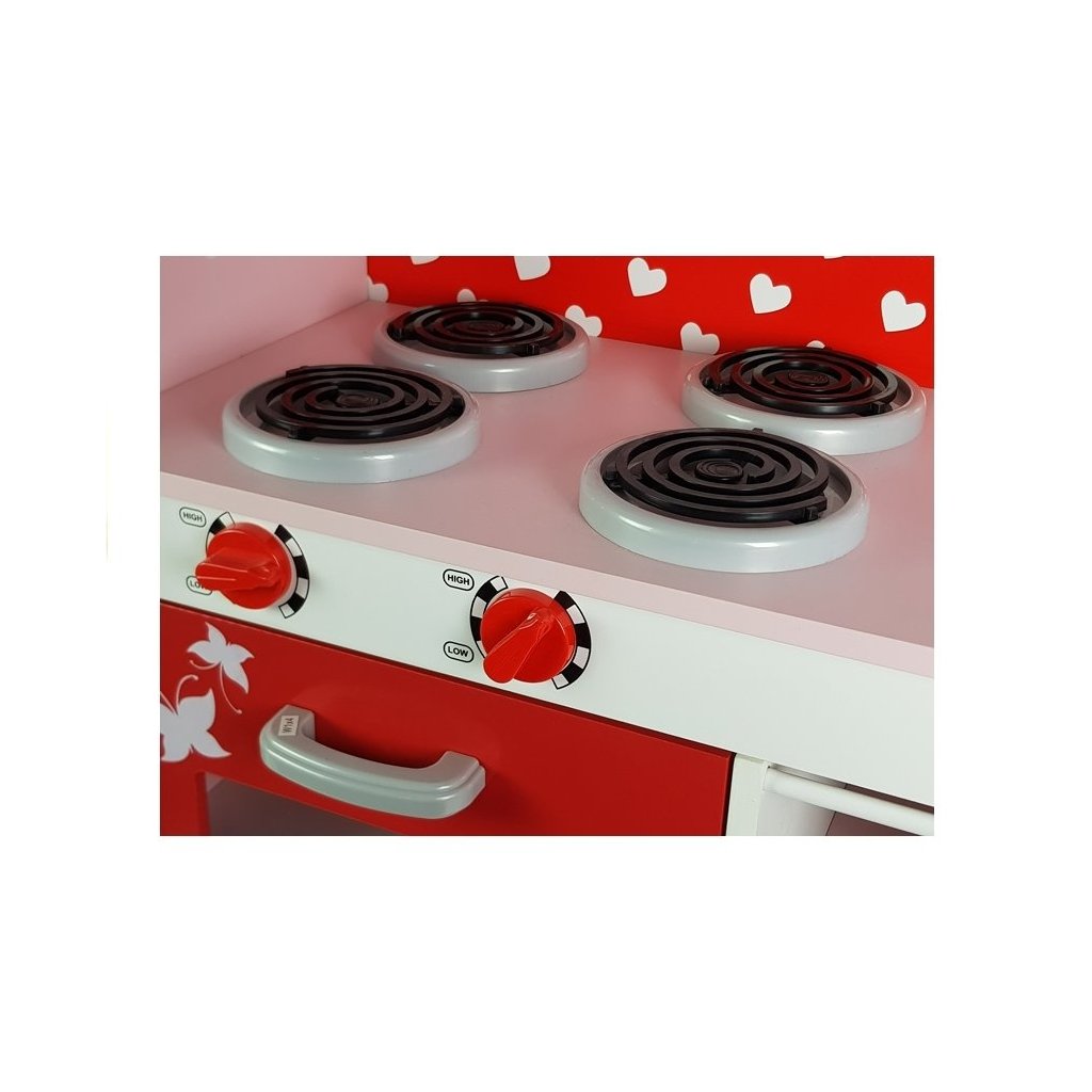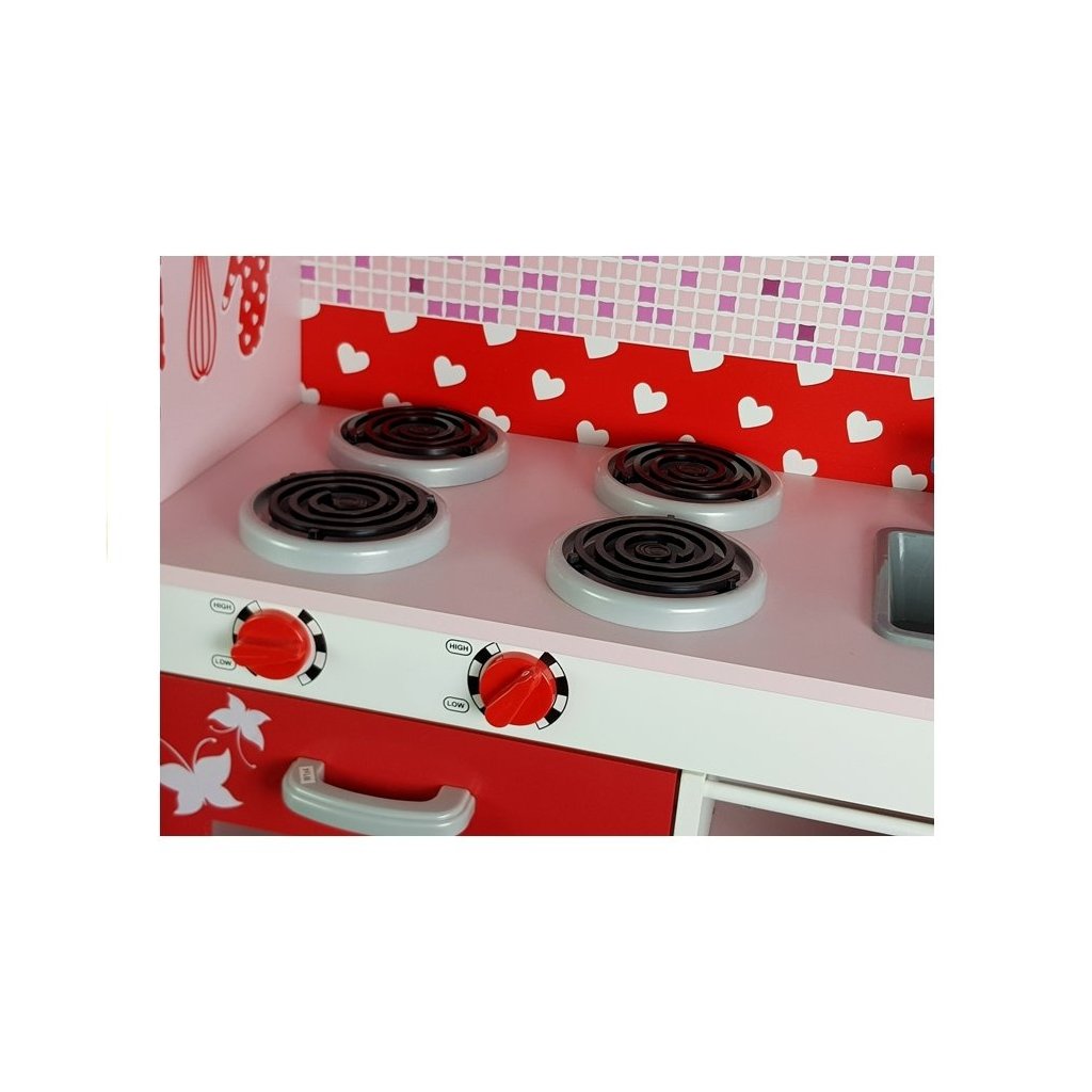 Dveře a skříňky se otevírají Dřevěná kuchyňka s mikrovlnnou troubou, lednicí a plynovým sporákem je jedinečným místem pro hraní a učení, vytvořená s ohledem na malé kuchaře