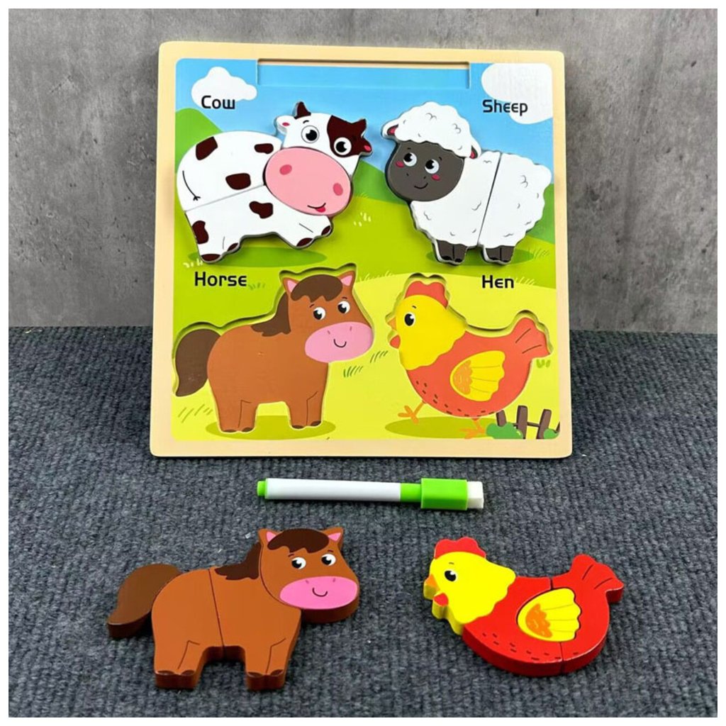 Každé zvíře se skládá z několika dílků, které je třeba správně umístit na svoje místo, což podporuje rozvoj koordinace ruky a oka, stejně jako logické myšlení Na zadní straně desky se nachází surovoustíratelná tabule pro kreslení, která dětem umožňuje cvičit kreslení a psaní pomocí přiloženého fixu