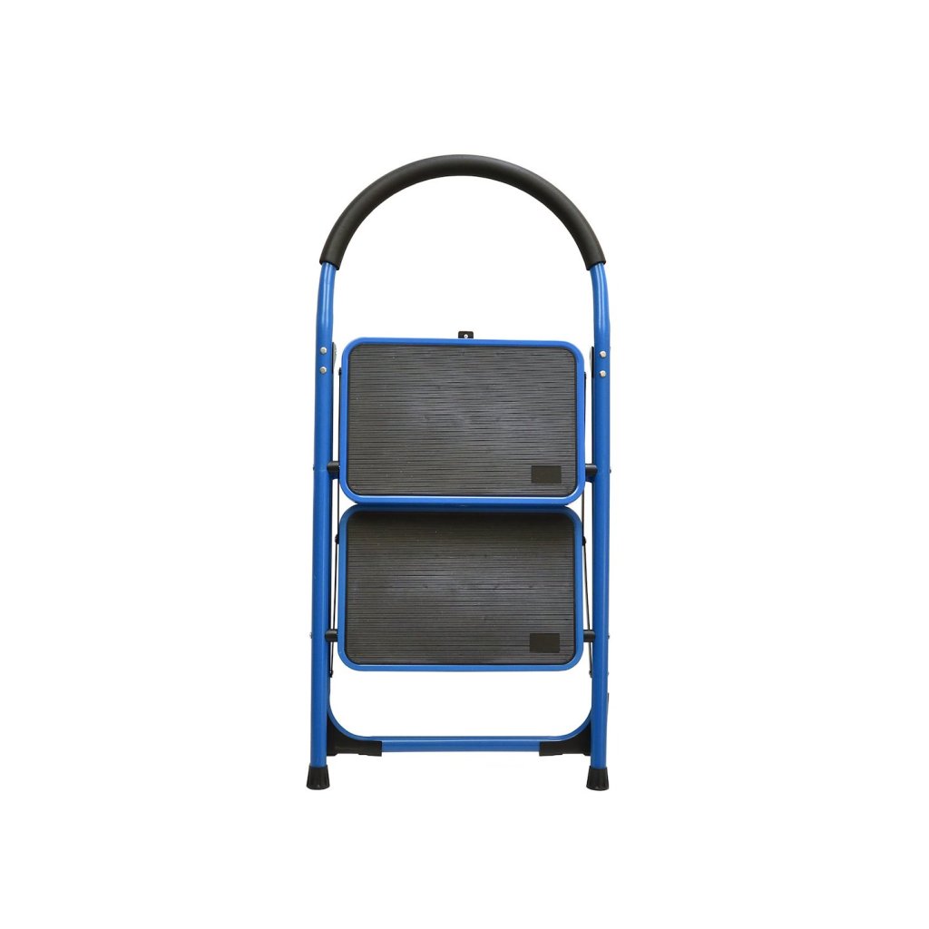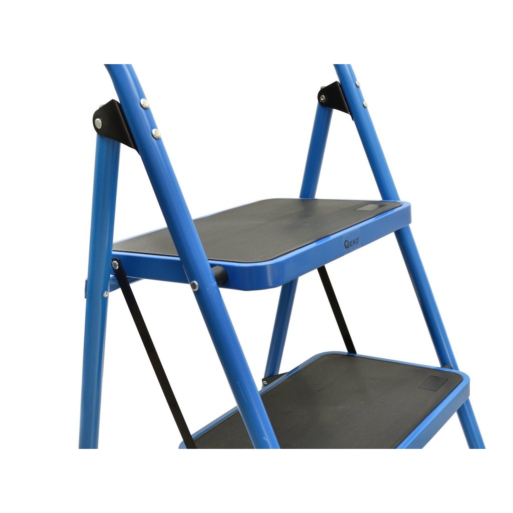 Skládací kovový žebřík se dvěma stupni je praktickým nástrojem pro provádění různých prací ve výškách. Žebřík má modrou barvu a černé prvky, které mu dodávají elegantní vzhled. Každý stupeň je pokryt černým, nerovným povrchem, který zajišťuje pohodlí a jistotu při chůzi.