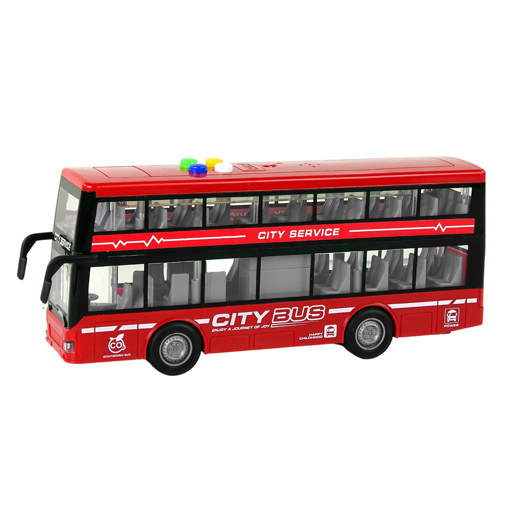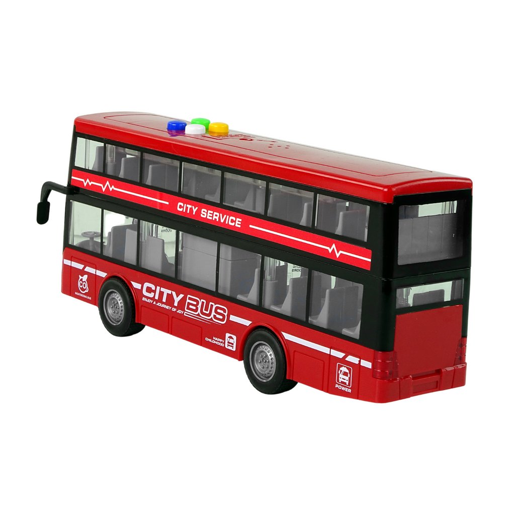 - Obsah balení: Dvoupodlažní autobus s efekty, pohonem třením, otevíracími dveřmi a bateriemi