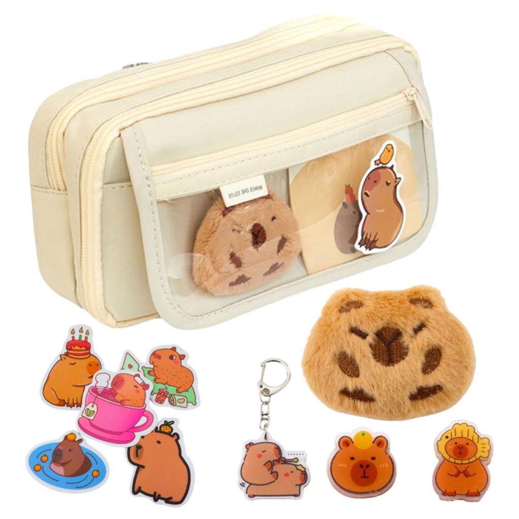 Dvoupřihrádkový školní penál s kapsičkami a kapybarskými doplňky je neuvěřitelně funkční a roztomilá sada, která se osvědčí nejen ve škole, ale také při každodenním používání doma nebo v kanceláři.