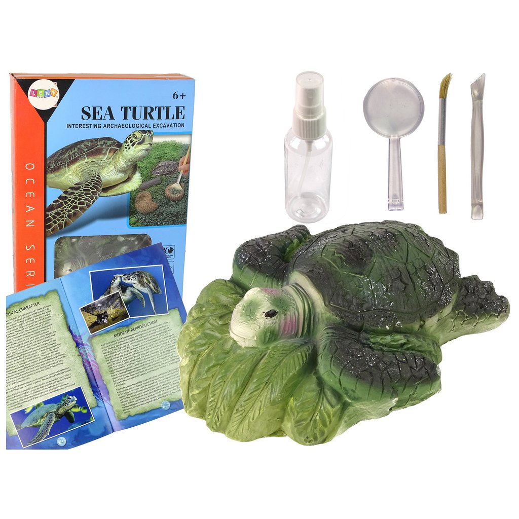 - V sadě najdete všechny nástroje, které malý archeolog potřebuje: realistickou fosilii želvy o rozměrech 14 cm x 11 cm, láhev na vodu, přesný kartáček na jemný prach, lupu a nástroj na kopání