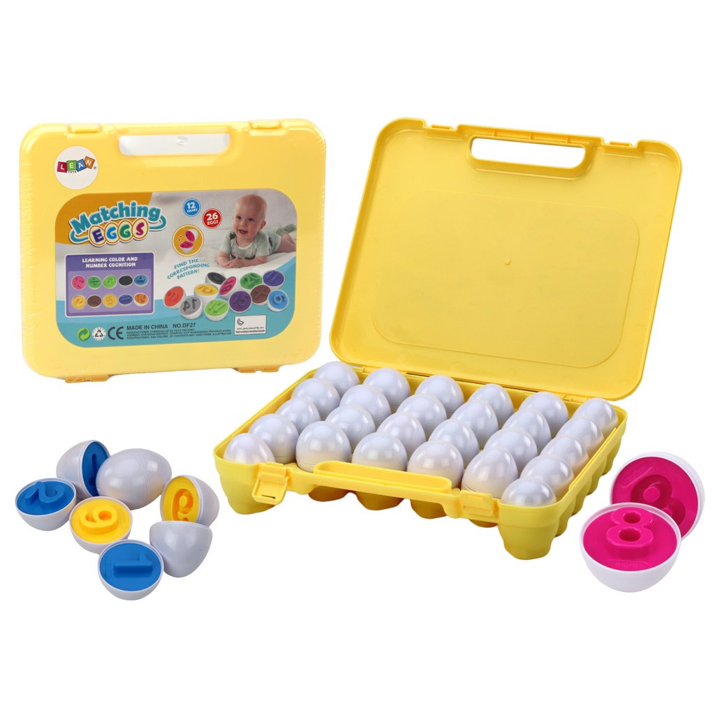 Vzdělávací skládačka Vejce v kufříku Nauka čísel a barev Sada vajec není jen hračka, ale skutečný nástroj k objevování a rozvíjení schopností vašeho malého objevitele Sada obsahuje 26 vajec v různých barvách, pod jejichž skořápkami se skrývají čísla, díky nimž se učení stává zábavou plnou vzrušujících objevů
