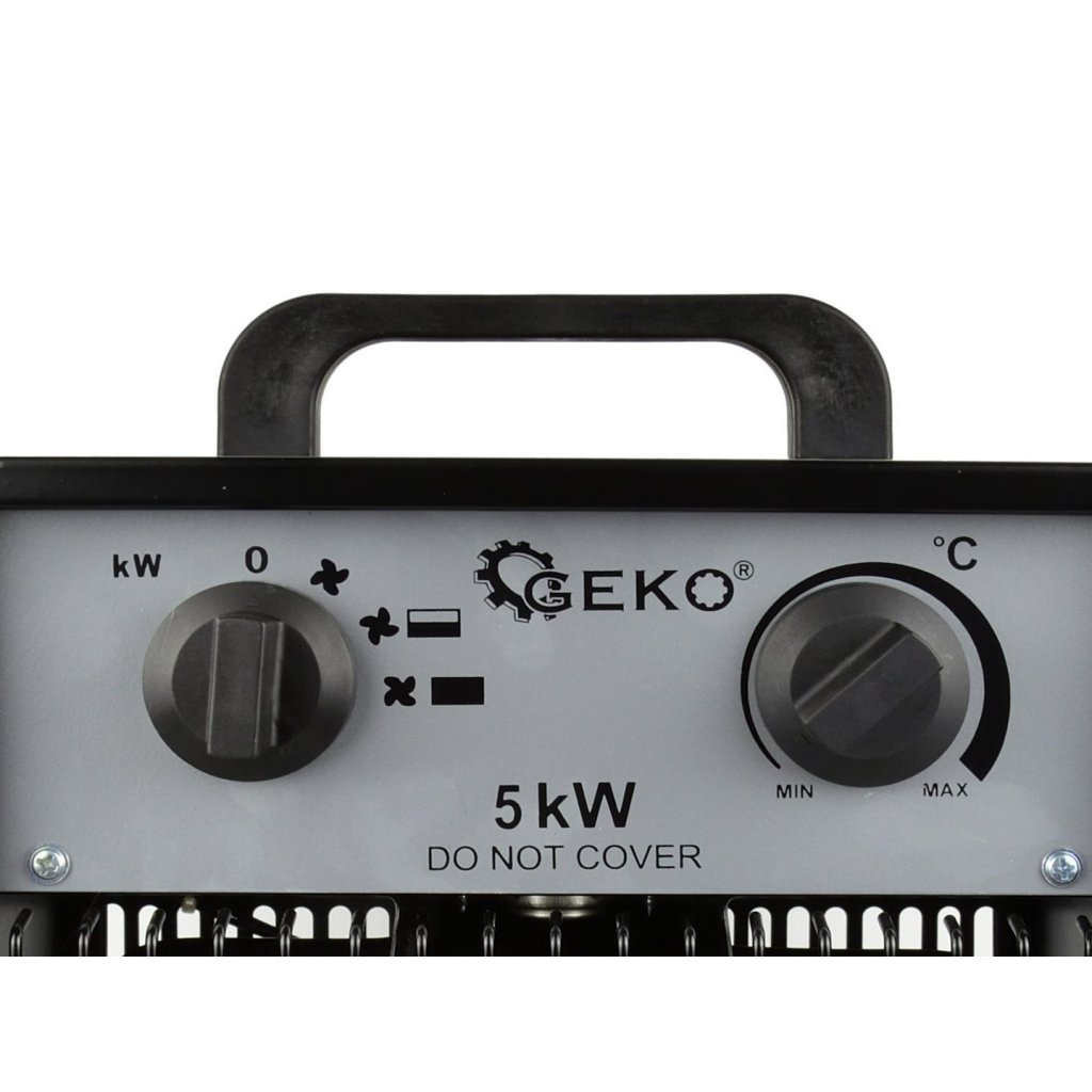 - Rozsah regulace výkonu: Režim 1: 30 W (samotný ventilátor, bez topení) Režim 2: 2,5 kW Režim 3: 5,0 kW