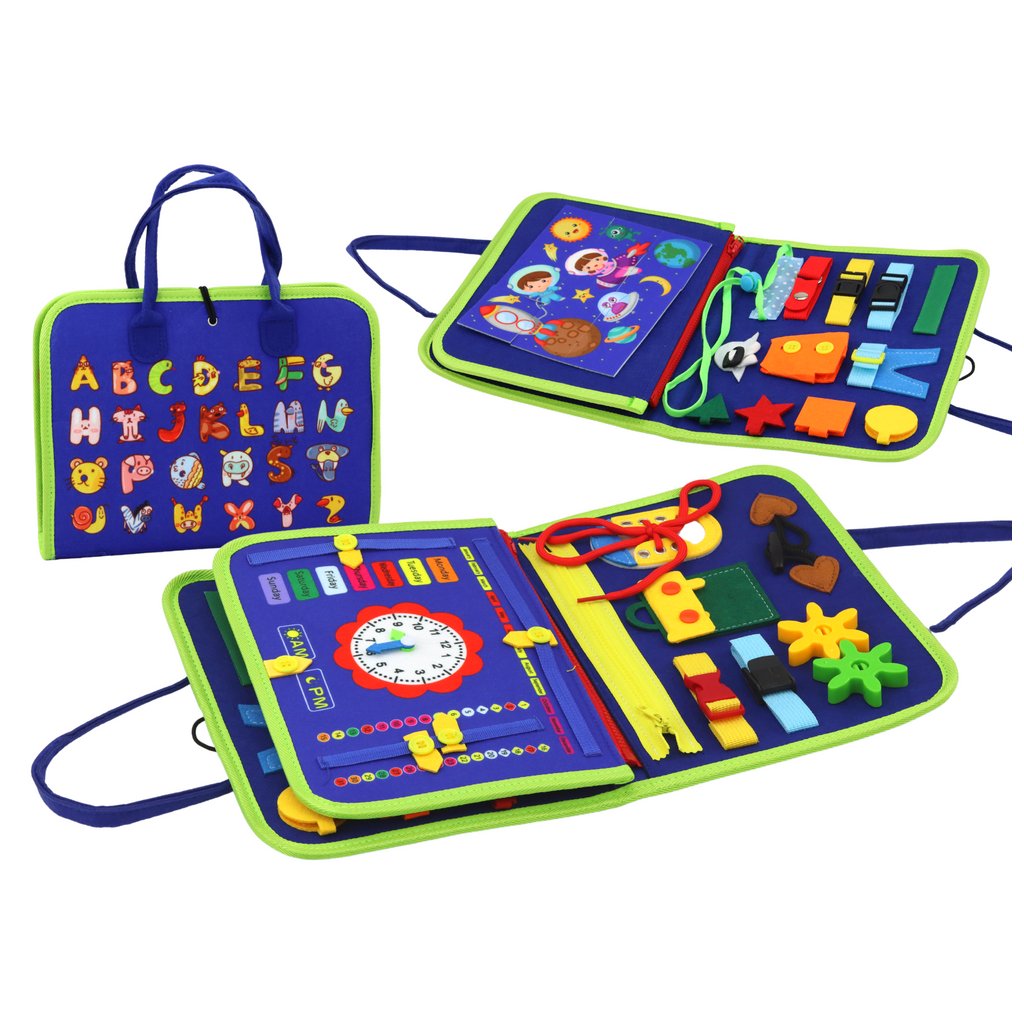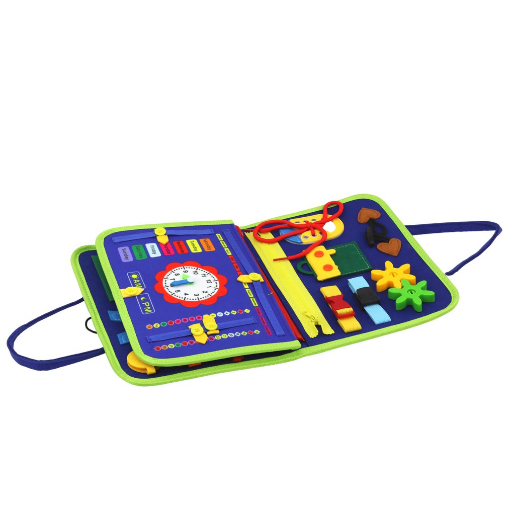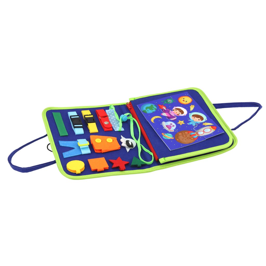 SENZORICKÁ VÝUKOVÁ TABULE Z FILCU Senzorická tabule je inovativní hračka, která rozvíjí manuální a kognitivní dovednosti dítěte prostřednictvím interaktivních prvků přizpůsobených malým ručkám Díky rozmanitým manipulačním úkolům, jako jsou posuvníky, knoflíky, hodiny, tkaničky nebo spony, se děti učí motorické koordinaci a samostatnosti při provádění každodenních činností