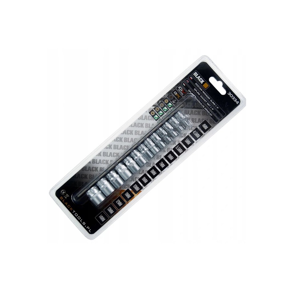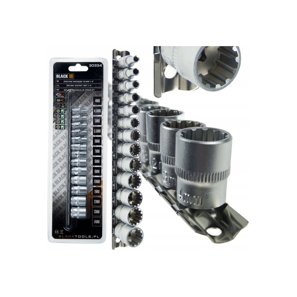 Vynikající sada 13 1/4 ČERNÝCH nástrčných klíčů ve velikostech (od 4 do 14 mm). Sférický tvar objímek činí celou věc velmi univerzální a umožňuje odšroubování šroubů Torx, Spline, 12-bodových, metrických, palcových a hranatých.