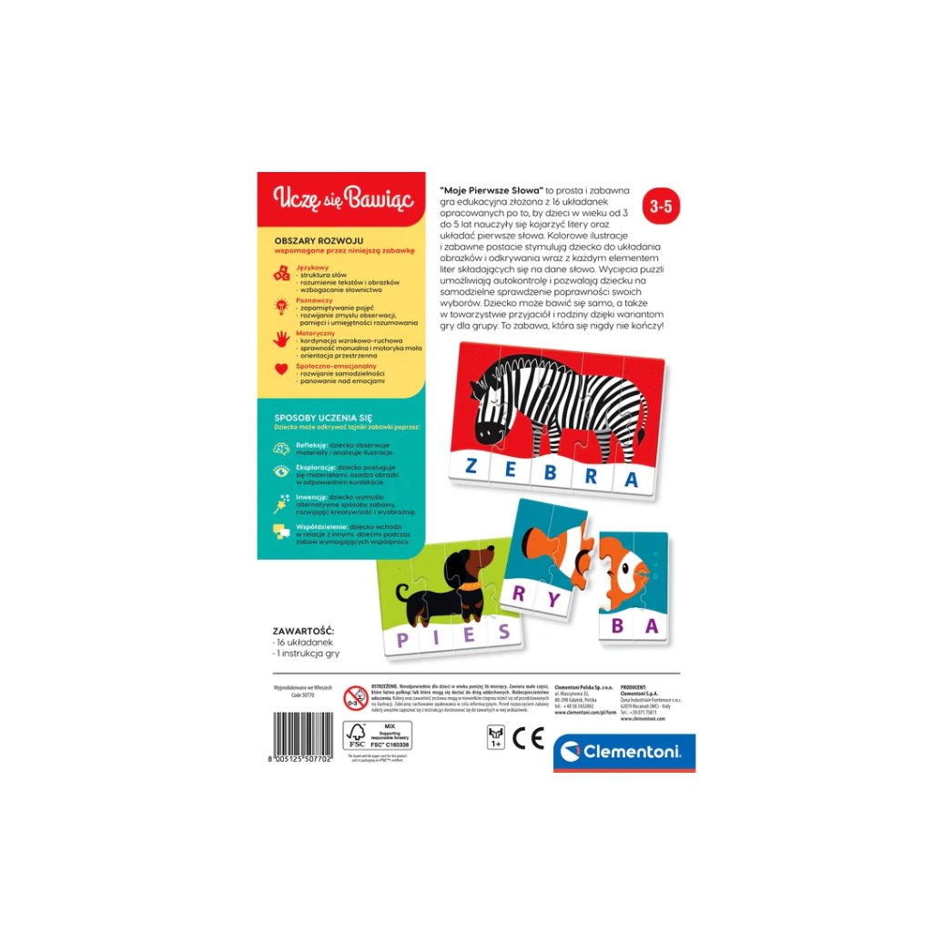 Objevte zábavný a vzdělávací svět hry Moje První Slova, která je určena pro děti ve věku od 3 do 5 let. Tato hra obsahuje 16 barevných puzzle, které podporují učení písmen a skládání prvních slov skrze hravé obrázky a postavy. S každým dílem dítě objevuje písmena a skládá slova, což stimuluje jeho kognitivní schopnosti. Díky autokontrolním výřezům dítě dokáže samo zkontrolovat správnost skládání, čímž podporuje svůj rozvoj a samostatnost.