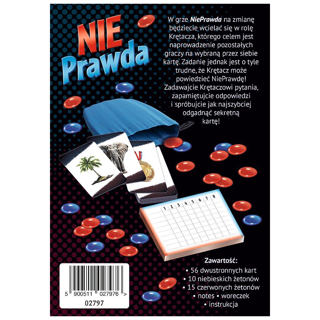 Hra Nepravda Trefl 02797 je zábavná a napínavá společenská hra, která je plná blafování a nejistoty! Máte schopnost odhalit, kterou kartu si zvolil Podvodník? To, zda říká pravdu nebo Nepravdu, závisí na vylosovaném žetonu. Kladení otázek, analýza odpovědí a být na pozoru, to jsou vaše zbraně – Podvodník může skutečně mluvit pravdu… nebo perfektně lhát! Dokážete ho přechytračit? Zjistěte, komu lze důvěřovat a kdo vás všechny tahá za nos!