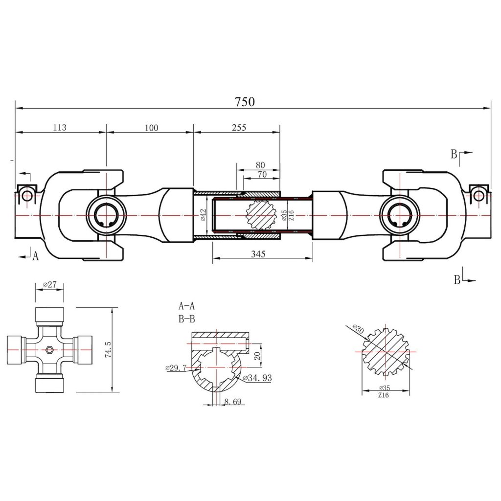Hřídel pro přenos výkonu 75 cm, typ Frez Technická specifikace: Typ: frézový Délka neroztaženého válce: 750 mm Délka roztaženého hřídele (s řetězem): 870 mm Maximální točivý moment: 600 Nm Křížové klo