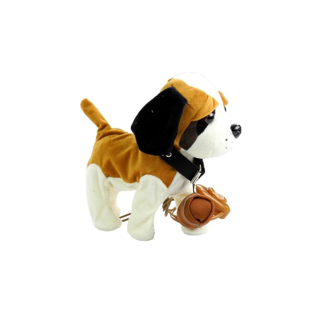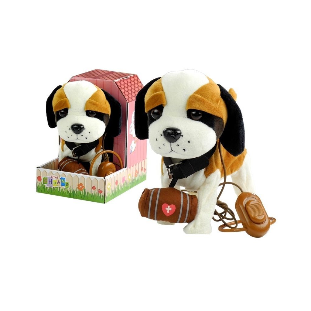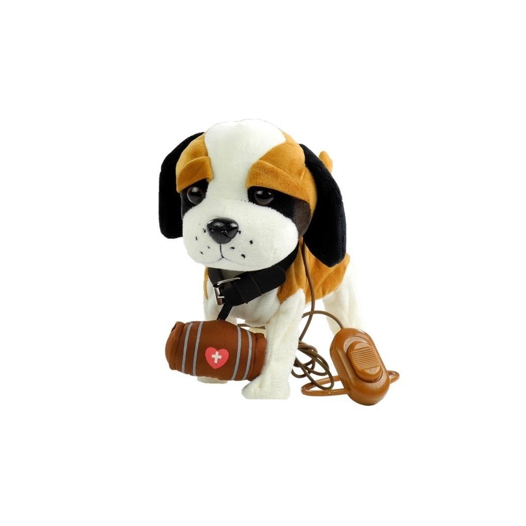 Hnědobílý bernardýn na vodítku je vyroben z měkkého a netoxického, 100% ekologického materiálu, který je velmi příjemný na dotek. Zvířátko má velké tmavé oči, vystupující ocásek a velký nos, který jemně leskne. Hračka má dlouhé vodítko zakončené přepínačem, díky kterému může dítě snadno ovládat svého pejska. Díky této možnosti bude hra pro dítě velmi realistická a především zajímavá. Pejsek také tančí a zpívá, což je pro dítě další atrakcí.
