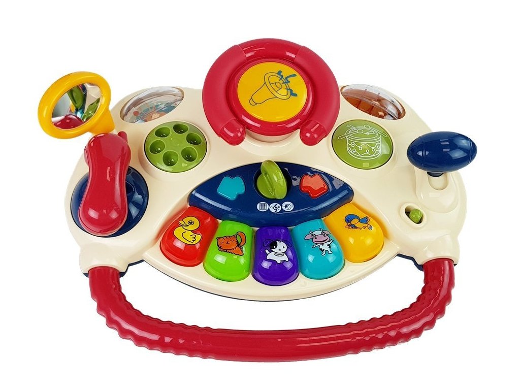 Proč 3 v 1? Hračka napodobující pravý volant, známý z rodičovských aut, přinese dítěti velkou radost. Je to výborné řešení na cesty autem, protože panel s volantem je odnímatelný. Další funkcí je chodítko, díky kterému se dítě učí chodit za doprovodu veselých zvuků. Třetí možností je tabule s volantem, kde dítě může objevovat hračku pod dohledem. Volant má na pravé straně řadicí páku a na levé nastavitelné zrcátko. Velikost volantu je přesně přizpůsobena malým dětským ručkám, což mu usnadní objevování nových zvuků a jevů. Příjemné zvuky, výrazná barevnost a co je nejdůležitější — pečlivé, solidně zpracování - splní očekávání všech rodičů a jejich dětí. Při hraní se dítě naučí rozpoznávat zvuky zvířat a používat předměty různých tvarů. Volant má 2 režimy hlasitosti pro přizpůsobení úrovně zvuku podle místa nebo doby hraní. Na levé straně volantu je telefon a uprostřed klávesy klavíru se třemi režimy. Vesele vyobrazená zvířátka na klávesách vyzývají k zábavě.