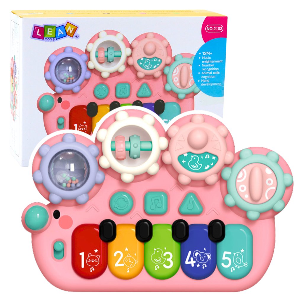 Interaktivní dětské pianinko s růžovými ozubenými koly je edukativní hračka, která podporuje vývoj dítěte již od 12 měsíce věku