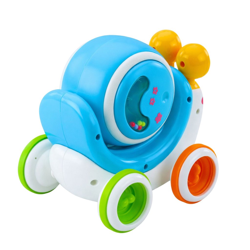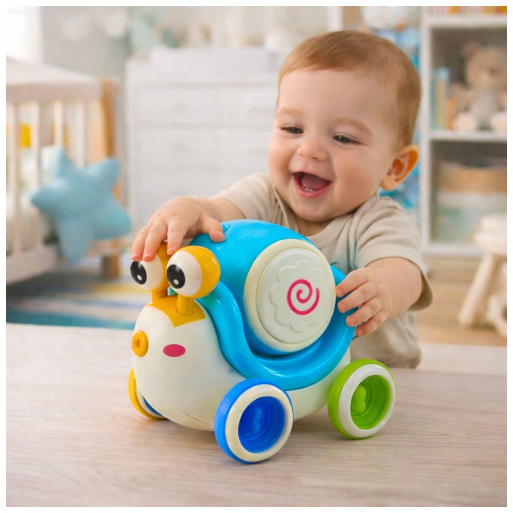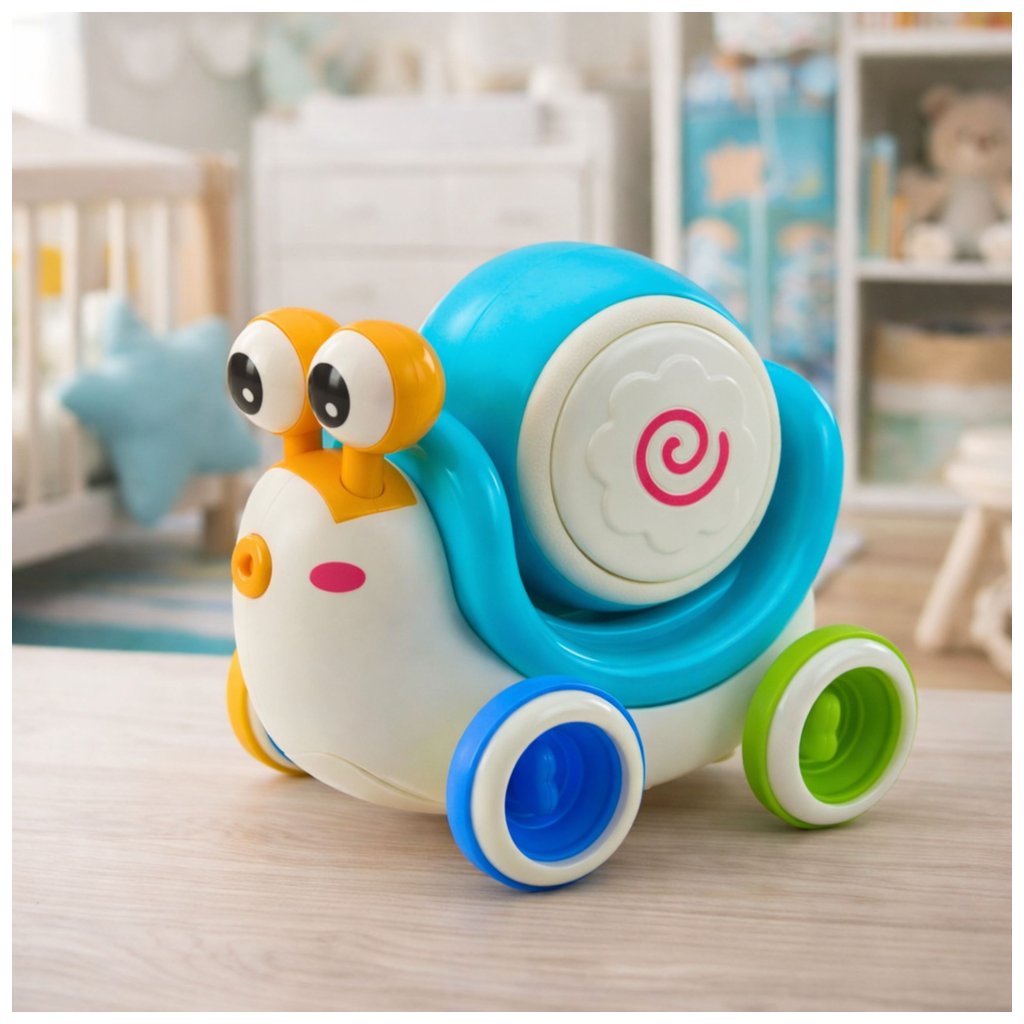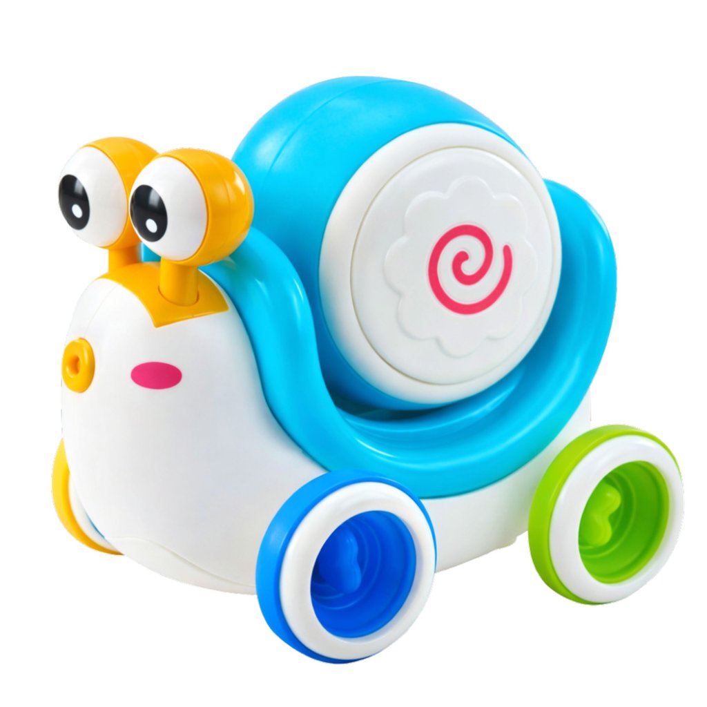 Šnek je vybavený měkkými silikonovými kolečky, které lze snadno zatlačit a vysunout, což příznivě ovlivňuje rozvoj jemné motoriky. Pohyblivé oči šneka poskytují zábavný prvek tím, že po stisknutí jednoho oko, druhé vyskočí, což učí děti o příčinné souvislosti. Díky kolečkům lze šneka také tlačit, čímž se povzbuzuje k pohybu a aktivní hře.